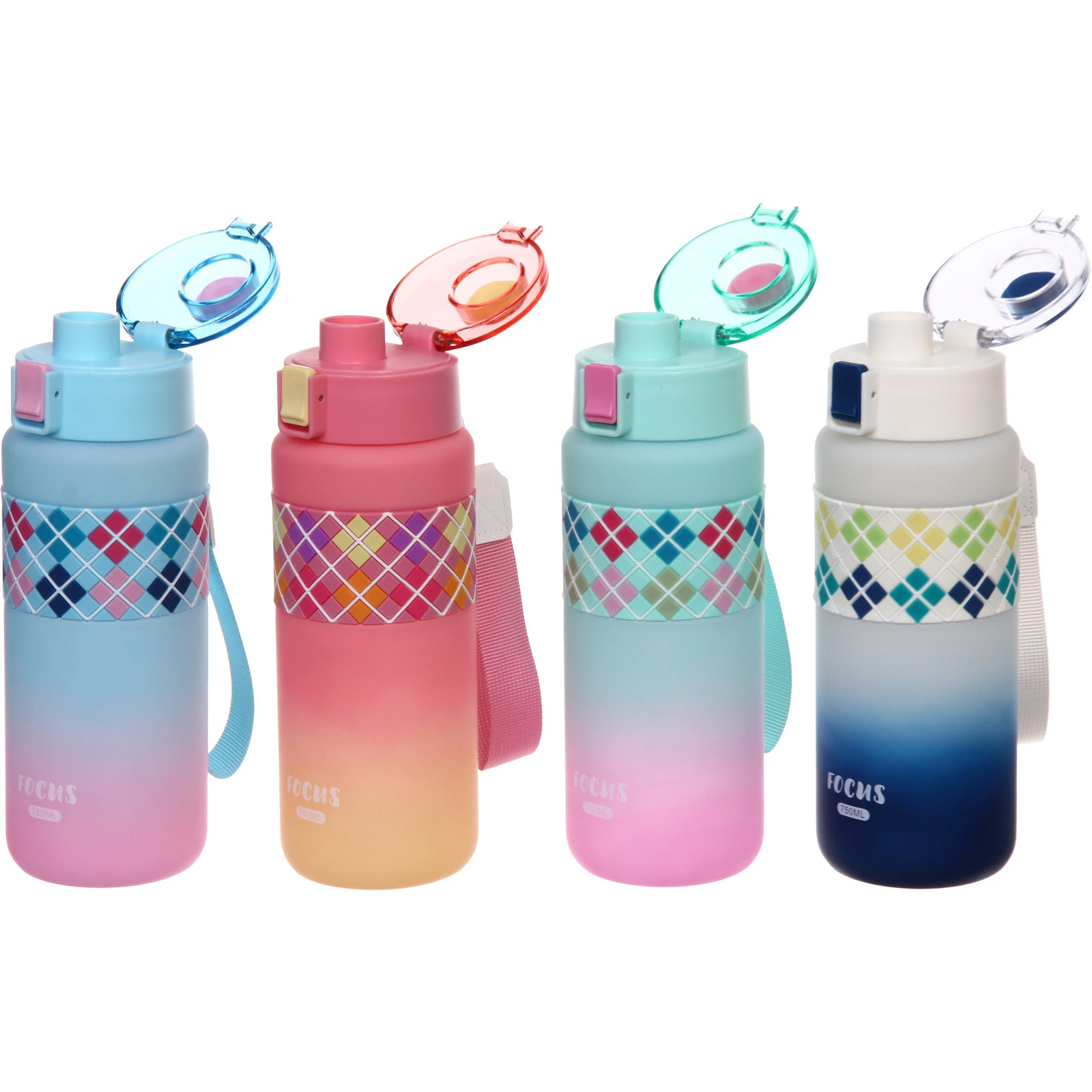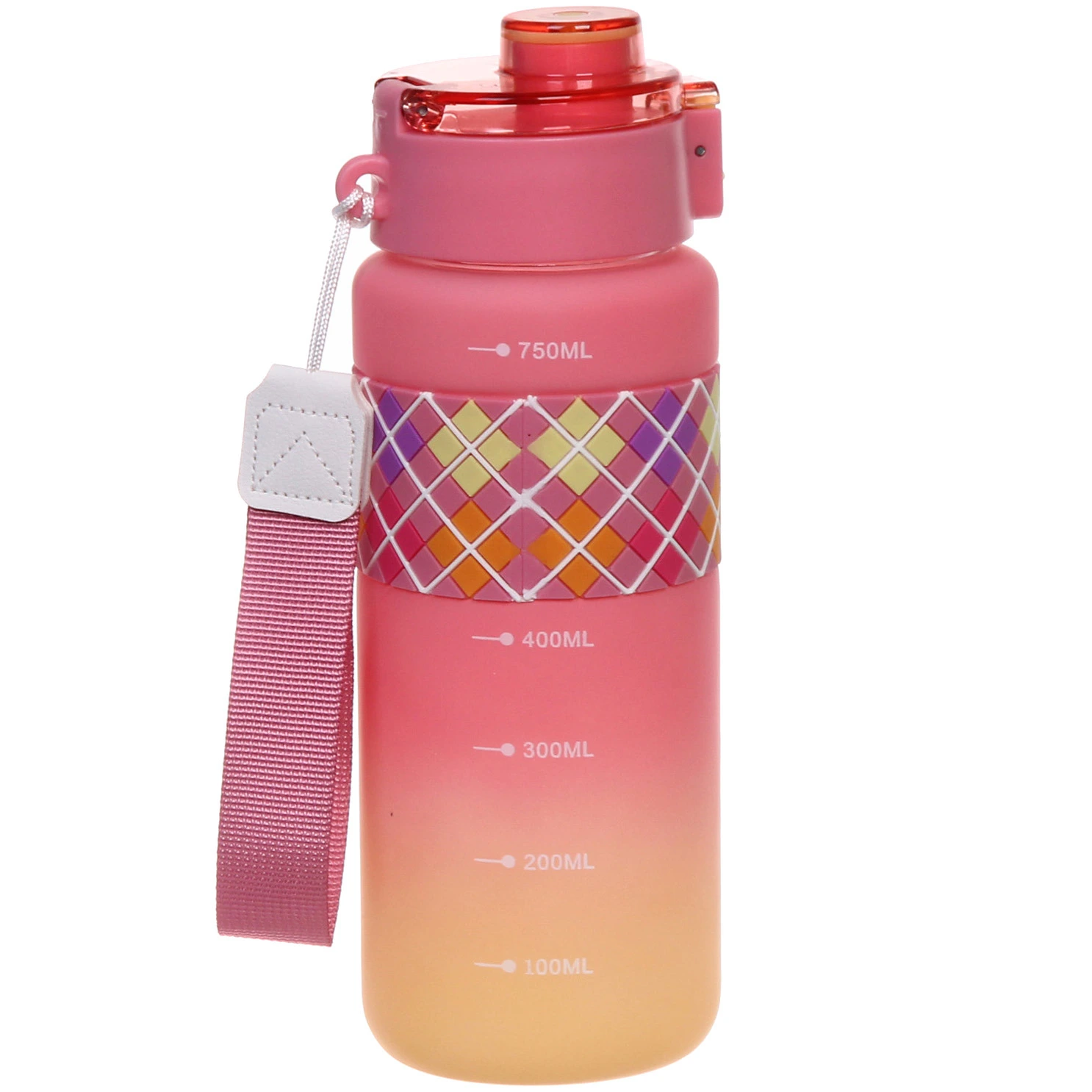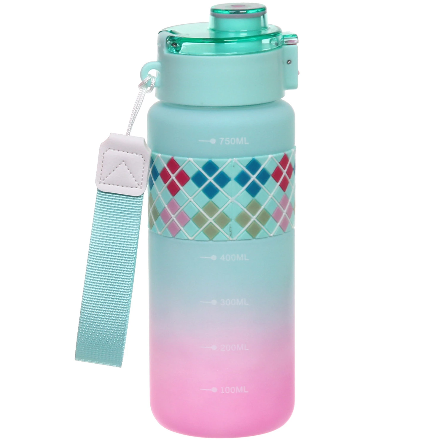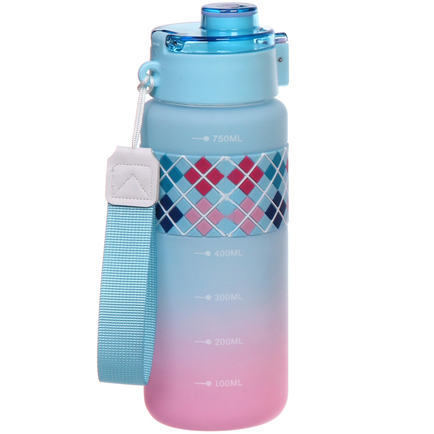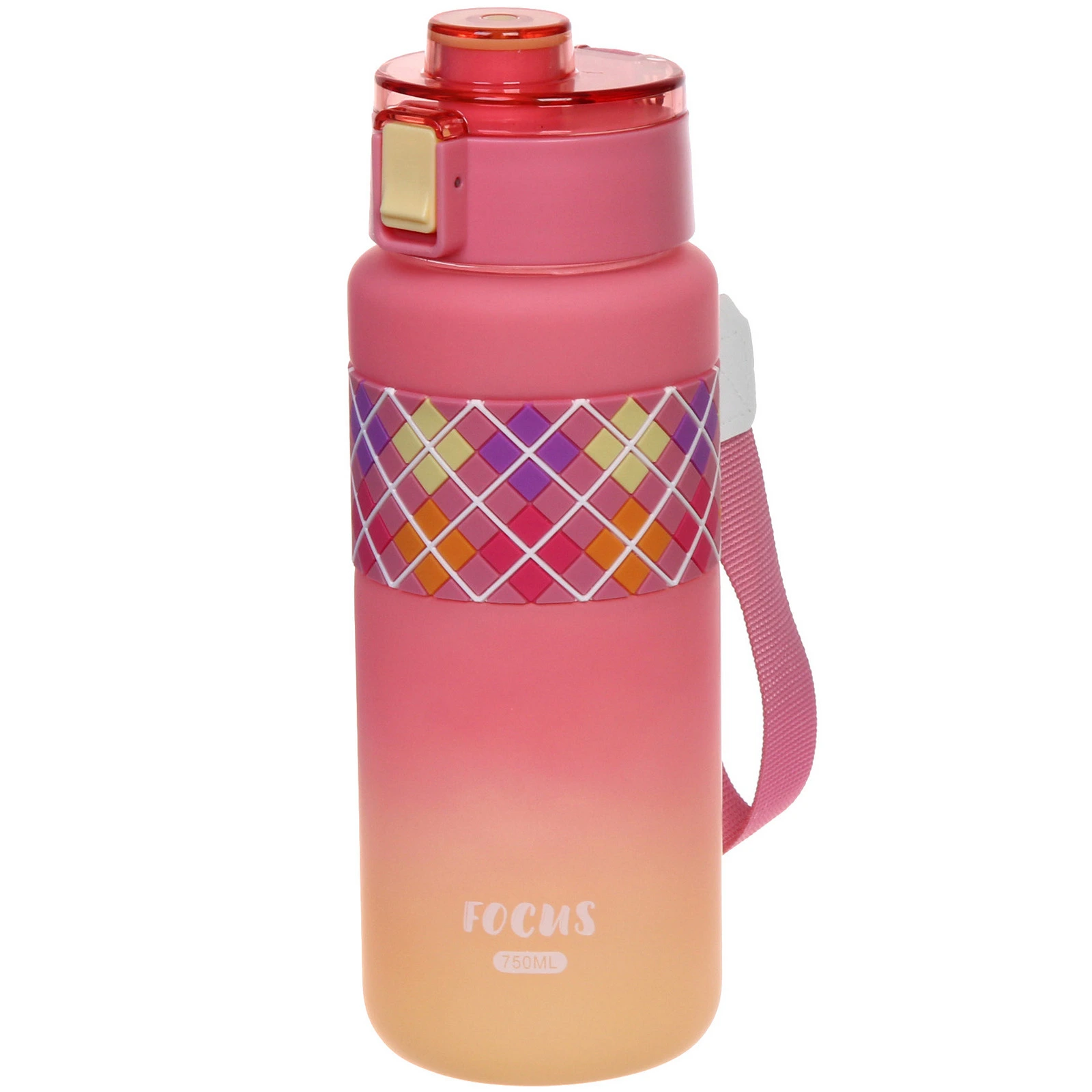 Корпус выполнен из пластика с матовой поверхностью, которая приятна на ощупь и менее скользит в руке. В центральной части расположена силиконовая вставка с рельефным узором — она обеспечивает более надежный хват. Объем 750 мл оптимален для активного дня без частых доливов.