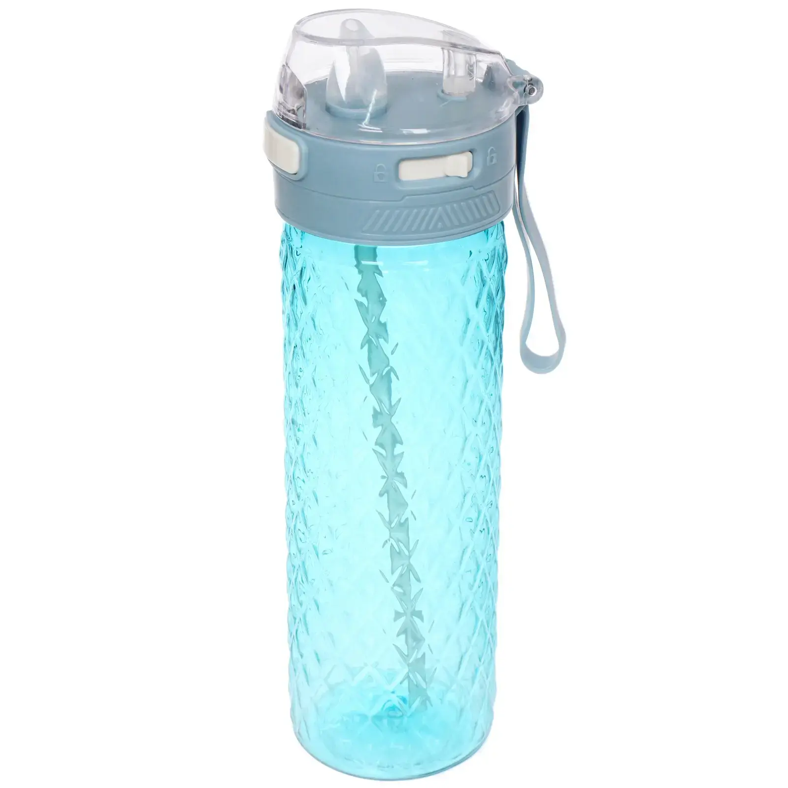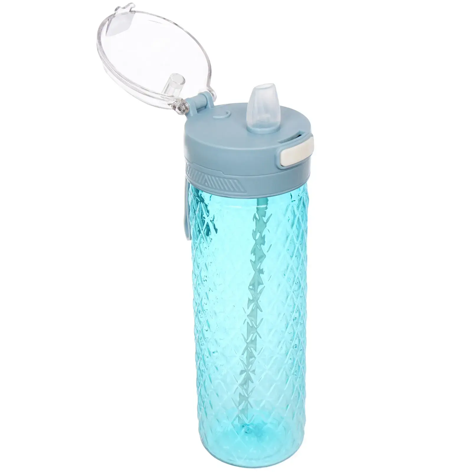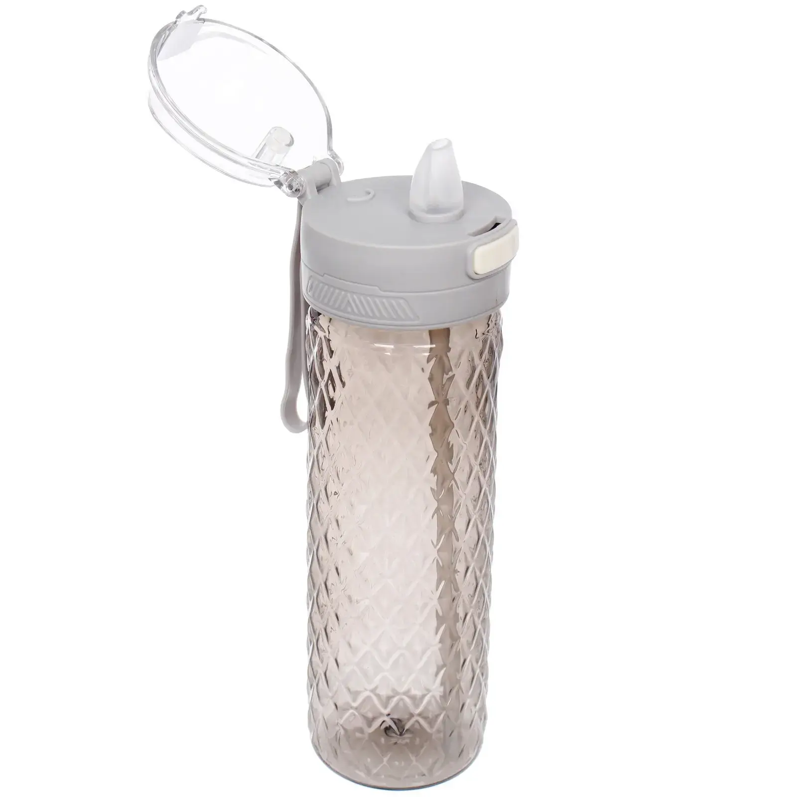 Бутылка имеет цилиндрическую форму с текстурированной поверхностью, что обеспечивает надежный захват. Крышка с кнопкой открывания и встроенной трубочкой позволяет легко пить на ходу, а герметичная конструкция предотвращает протекание. Ремешок для удобного удержания делает использование бутылки еще более комфортным.