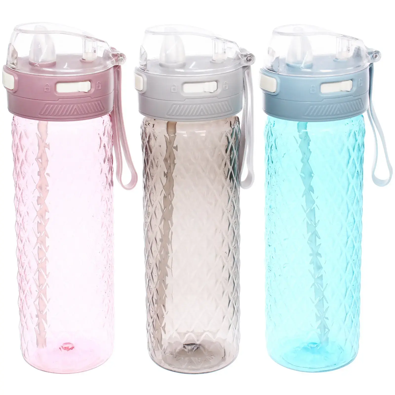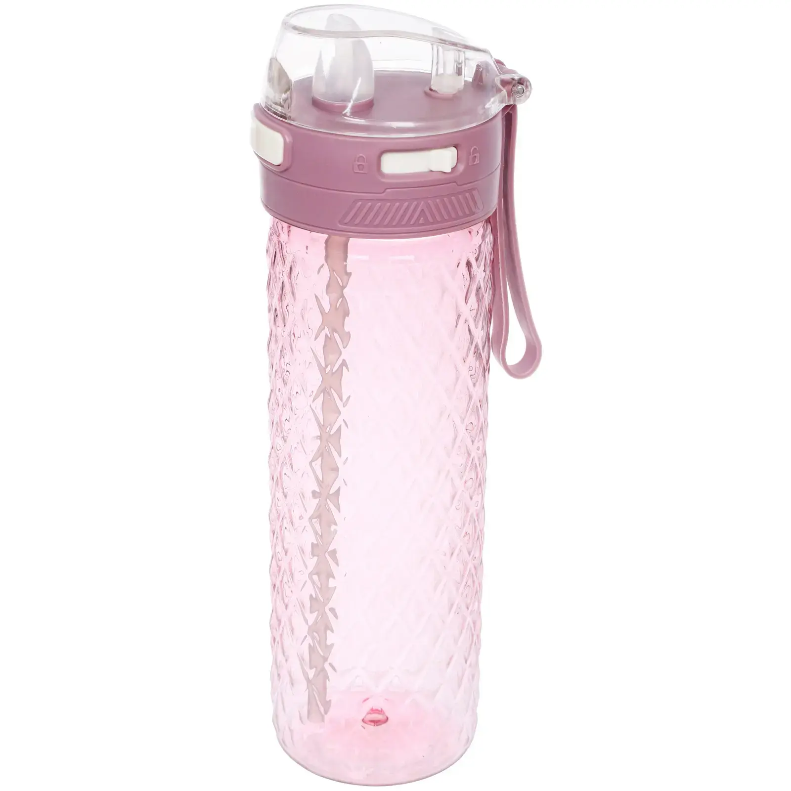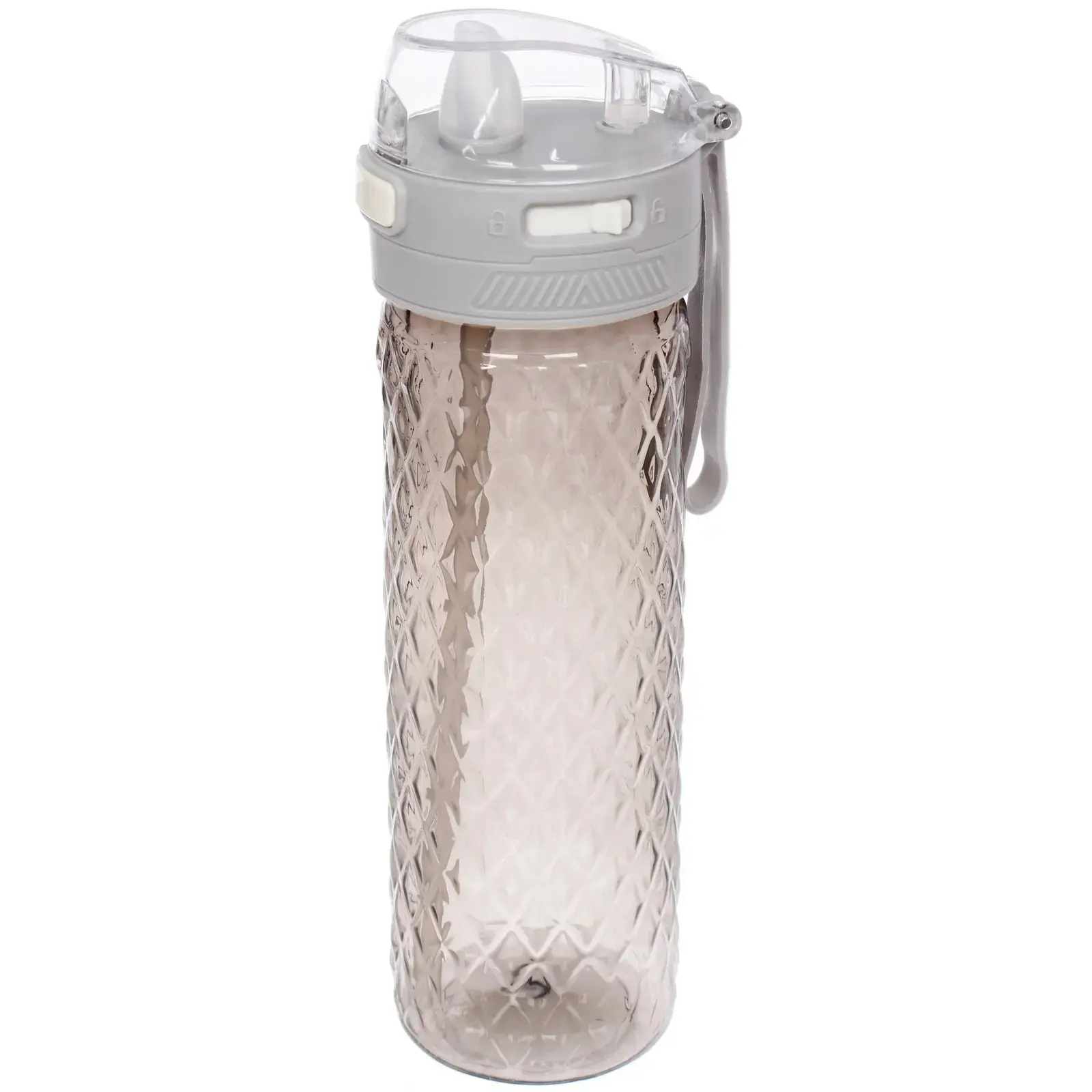 Бутылка имеет цилиндрическую форму с текстурированной поверхностью, что обеспечивает надежный захват. Крышка с кнопкой открывания и встроенной трубочкой позволяет легко пить на ходу, а герметичная конструкция предотвращает протекание. Ремешок для удобного удержания делает использование бутылки еще более комфортным.