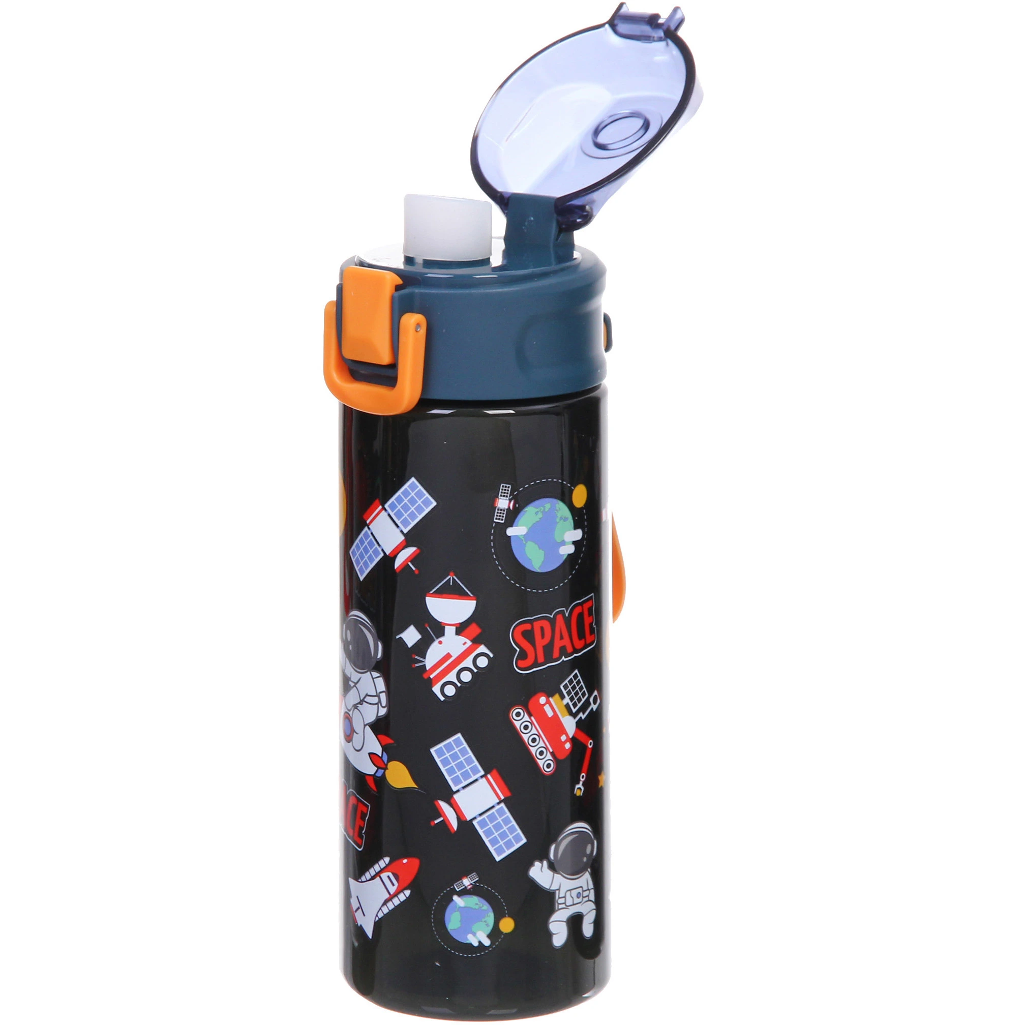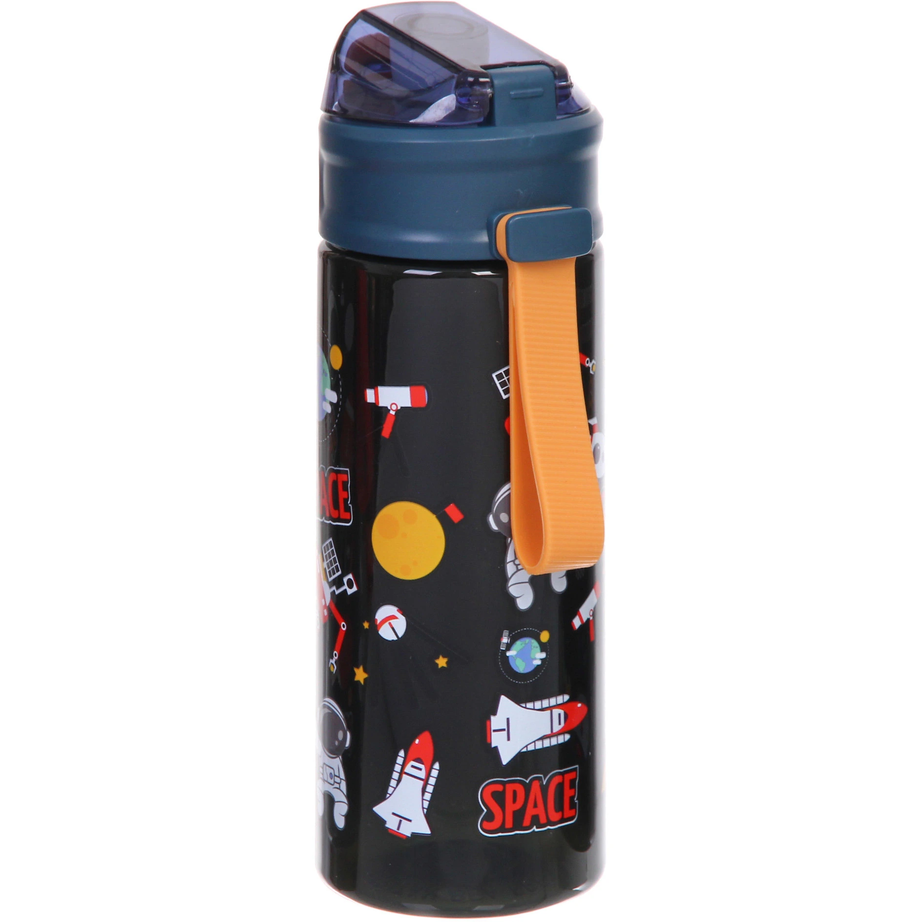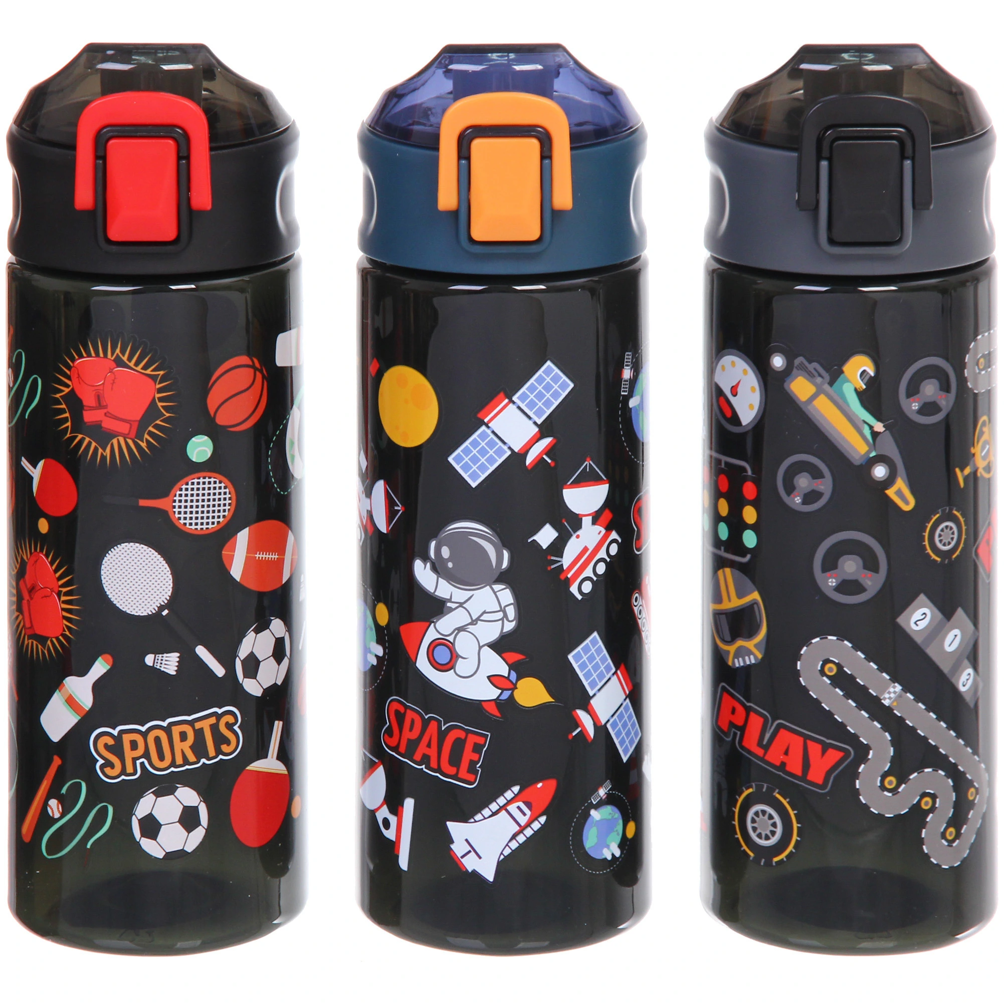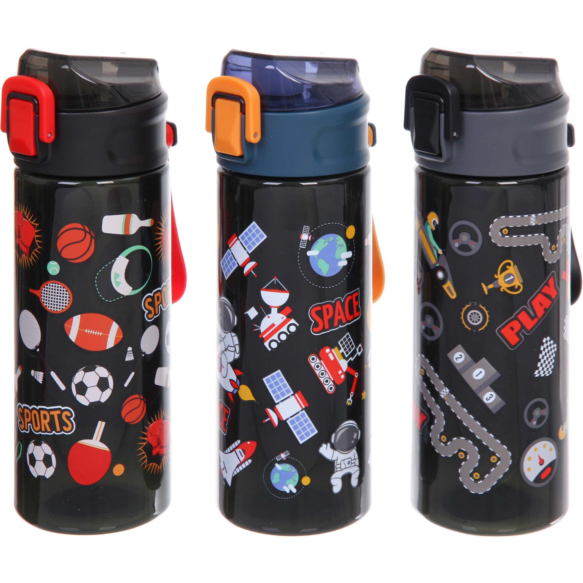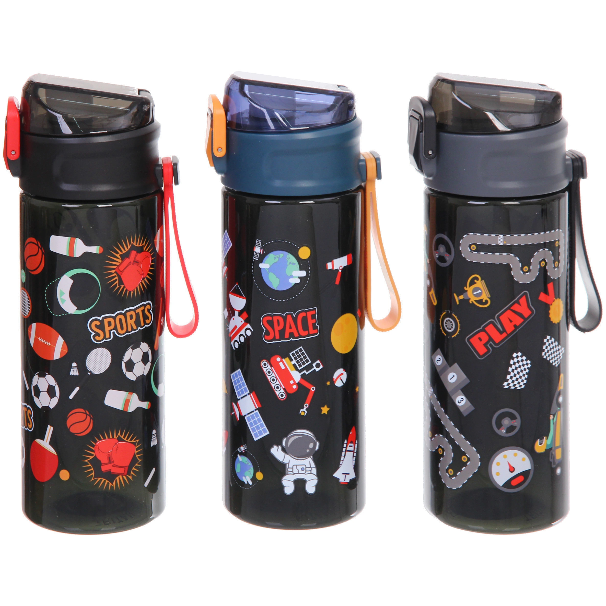 Важно: Товар поставляется в цветовом ассортименте. Конкретный дизайн (спорт, космос или гонки) и цвет ремешка (красный, оранжевый или тёмный) определяются случайным образом из наличия на складе. Объём: 600 мл.