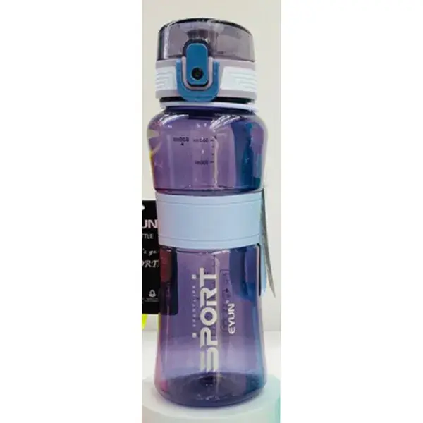 Прозрачные стенки позволяют видеть остаток жидкости, а цветовые варианты (розовый, голубой, черный, фиолетовый) помогают подчеркнуть индивидуальность. Съемный ремешок и плоское дно обеспечивают удобное хранение в рюкзаке или держателе.