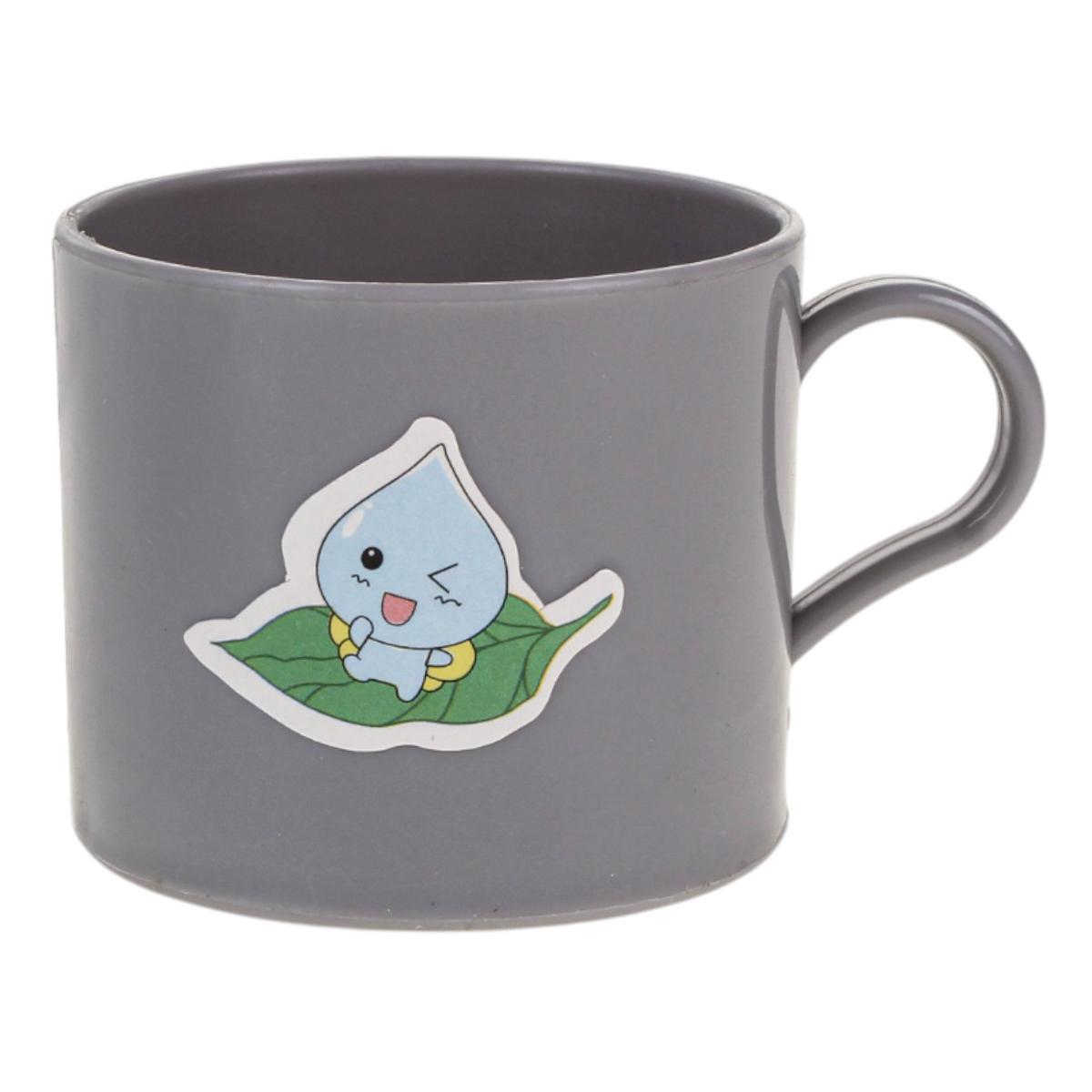 Высота кулера с бутылкой — 21,5 см, ширина основания — 10,5 см. Объем кружки — 60 мл, объем бака — 300 мл. Корпус выполнен в нежном голубом цвете, резервуар прозрачный, кружка серого оттенка с забавным персонажем в виде капли воды на листе. Для работы необходимых звуковых элементов питания (не входят в комплект).