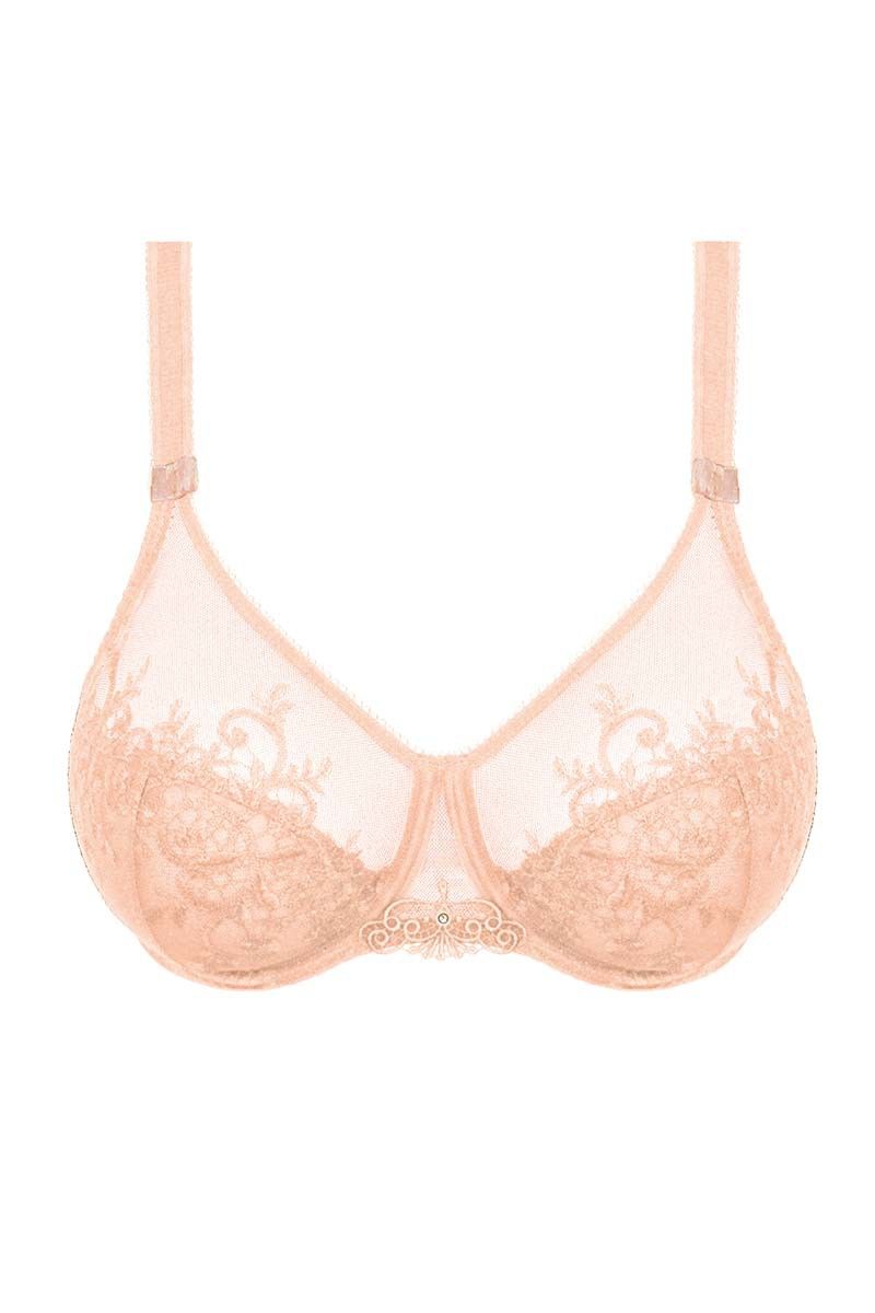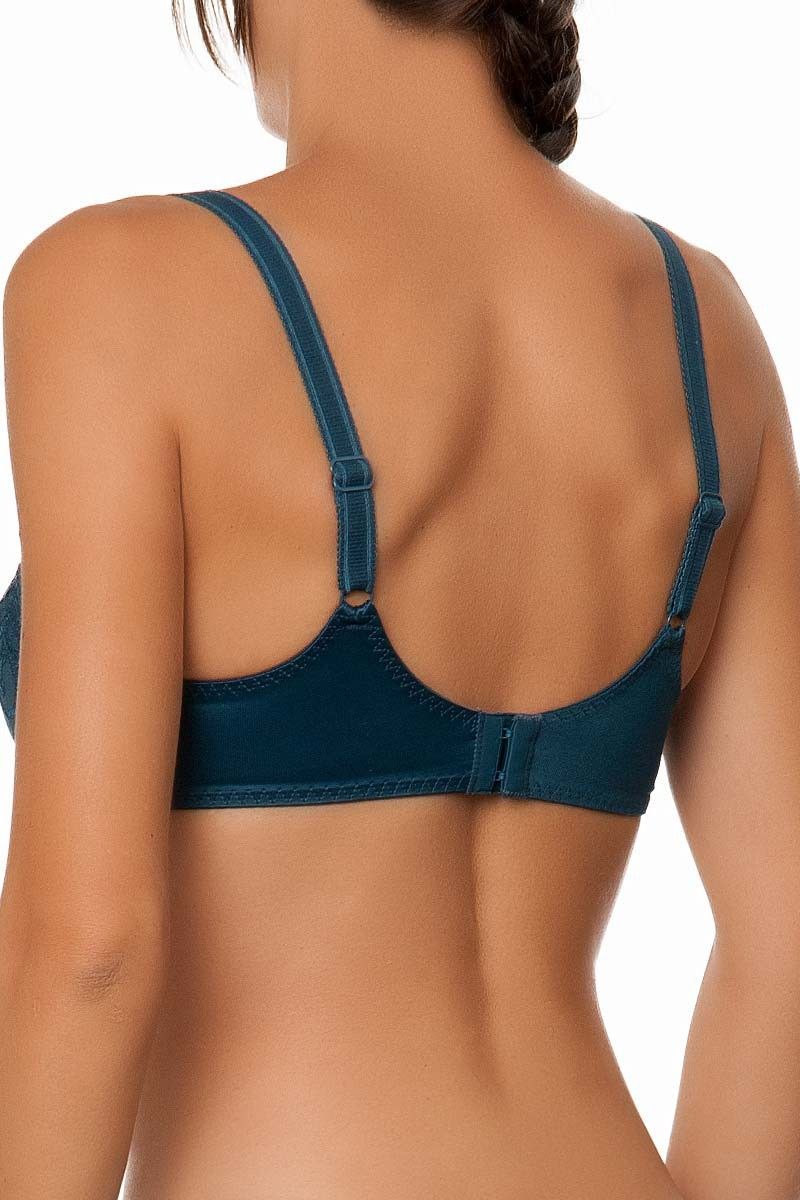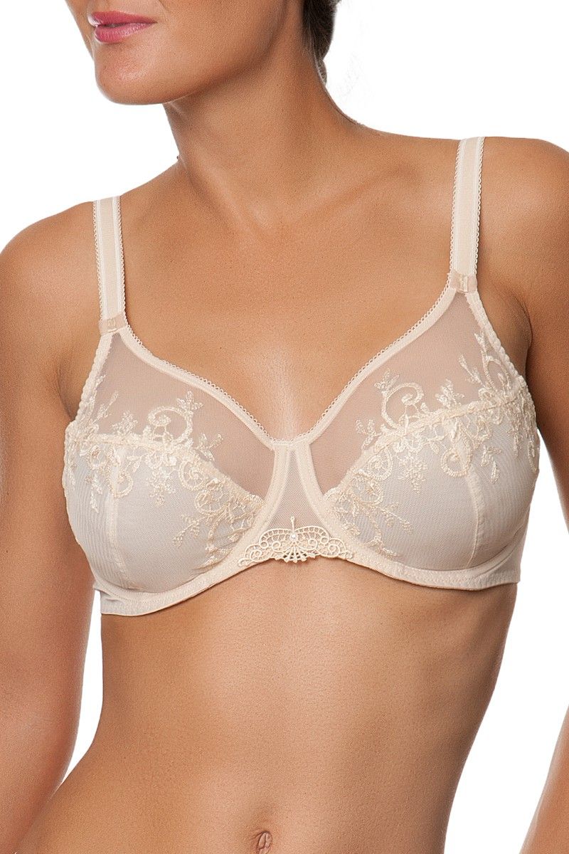 Модель выполнена с классическим кроем из нескольких частей, что позволяет чашке точно повторять анатомию и деликатно приподнимать грудь. Верх чашек выполнен из полупрозрачной сетки, создающей визуальную легкость, а нижняя часть дополнена изысканной вышивкой с растительным узором. Подкладка из прочного материала обеспечивает непрозрачность и дополнительную поддержку.