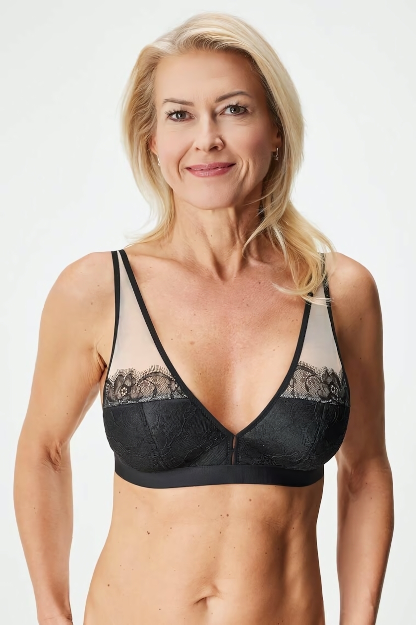 Прозрачные сетчатые вставки в верхней части и боковых панелях обеспечивают воздухопроницаемость, а широкая нижняя лента предотвращает скольжение. Мягкие чаши без косточек не оставляют следов на коже даже после длительного ношения.
