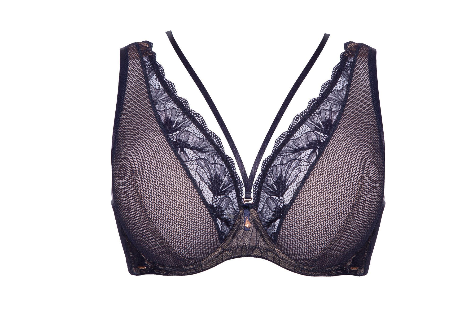 Состав: 90% полиамид + 10% эластан для идеального облегания. Темно-синий базовый цвет сочетается с контрастной подкладкой телесного оттенка. Кружевные элементы выполнены по технологии бесшовного соединения для повышенной износостойкости.