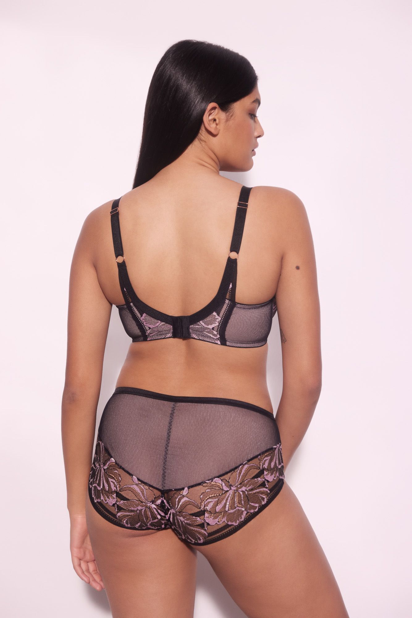 Бюстгальтер Glossy Iris выделяется среди других благодаря своему качеству и вниманию к деталям. Внешняя сторона бюстгальтера покрыта нежным кружевом с черно-розовыми цветами, что придает ему изысканный вид. Спинка из черной сетки, продублированной розовой сеткой, обеспечивает комфорт и воздухопроницаемость. Металлическая фурнитура цвета меди добавляет нотку роскоши и прочности.