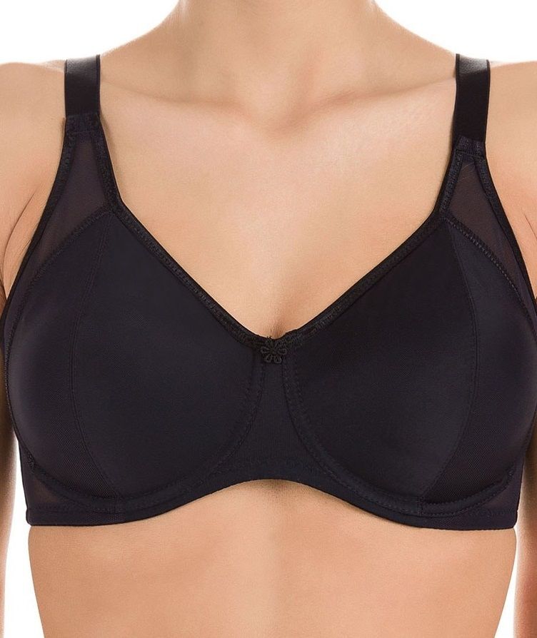 Малорастяжимые бретели с возможностью регулировки и каркасные чашки с тюлевыми вставками обеспечивают плотное прилегание без эффекта «выскакивания». Специальные боковые панели с вертикальными косточками предотвращают скручивание даже при активном движении.
