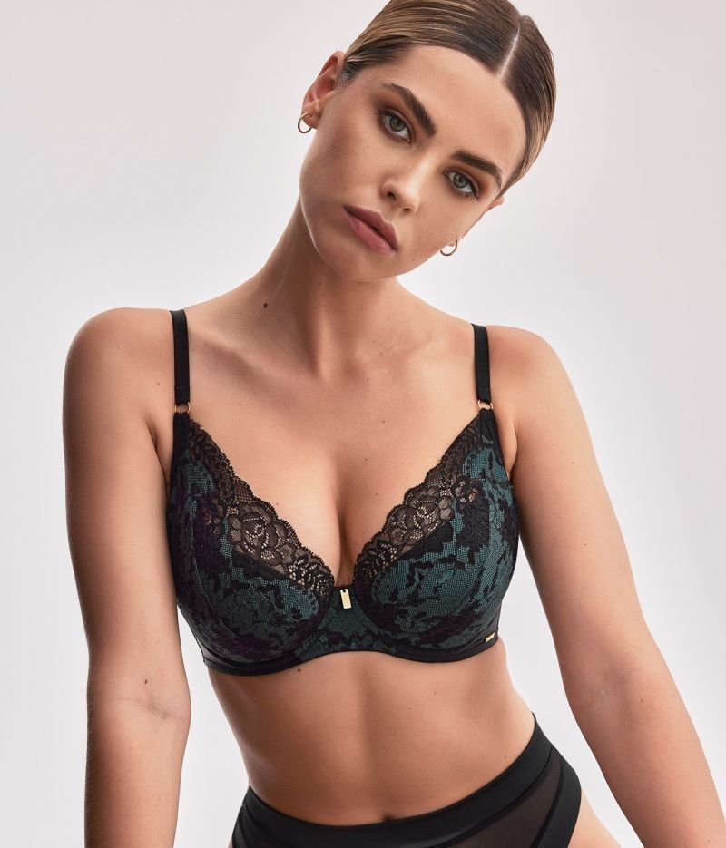 Комбинация из черного кружева и золотистой фурнитуры создает эффектный контраст. Двухслойные чашки с тонким поролоном сохраняют форму, а декоративная сетчатая спинка обеспечивает воздухопроницаемость.