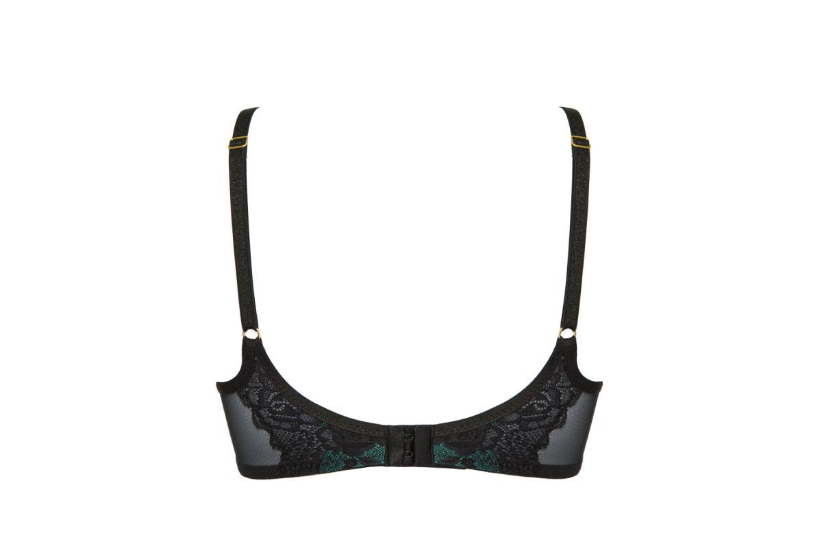 Внутренняя сторона бюстгальтера выполнена из мягкого хлопкового трикотажа, что обеспечивает комфорт при длительной носке. Черно-изумрудное кружево не только украшает изделие, но и гарантирует воздухопроницаемость.