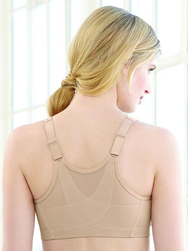 Модель выполнена из комбинации микрофибры и сетчатой ткани (40% нейлон, 30% полиэстер, 20% хлопок, 10% эластан), что обеспечивает воздухопроницаемость и долговечность. Т-образная спинка с усиленными эластичными лентами из хлопка и лайкры надежно фиксирует бюстгальтер на теле.