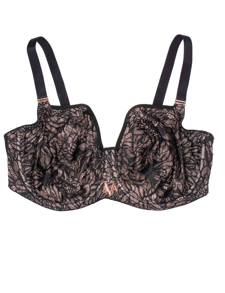 Черный гипюр с цветочным узором и декоративным V-образным элементом создает эффект роскошного нижнего белья. Прозрачная сетчатая вставка на спинке обеспечивает воздухопроницаемость, а медные крючки добавляют стильный акцент. Точный размер 85G (европейская маркировка) гарантирует идеальное соответствие вашим параметрам.