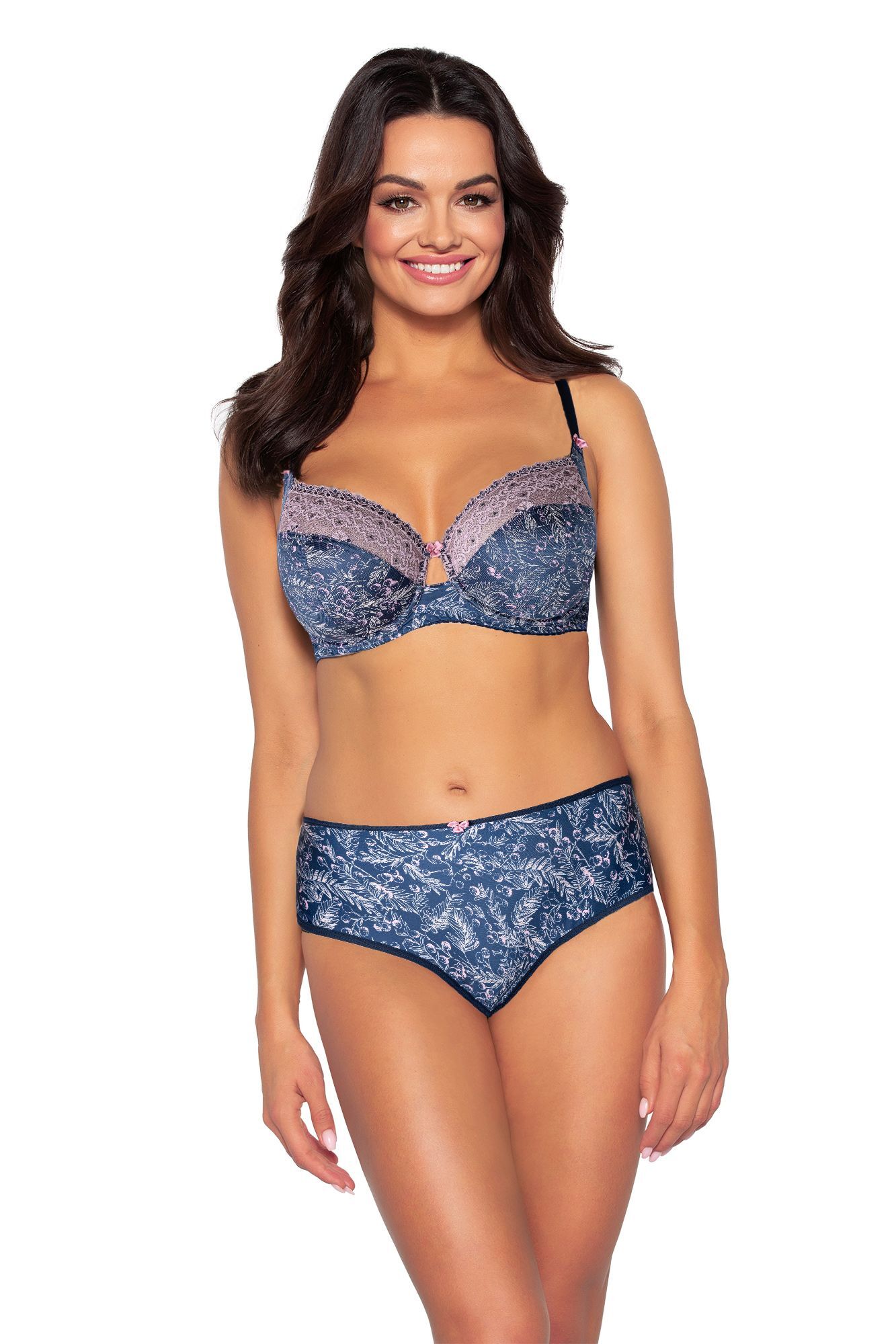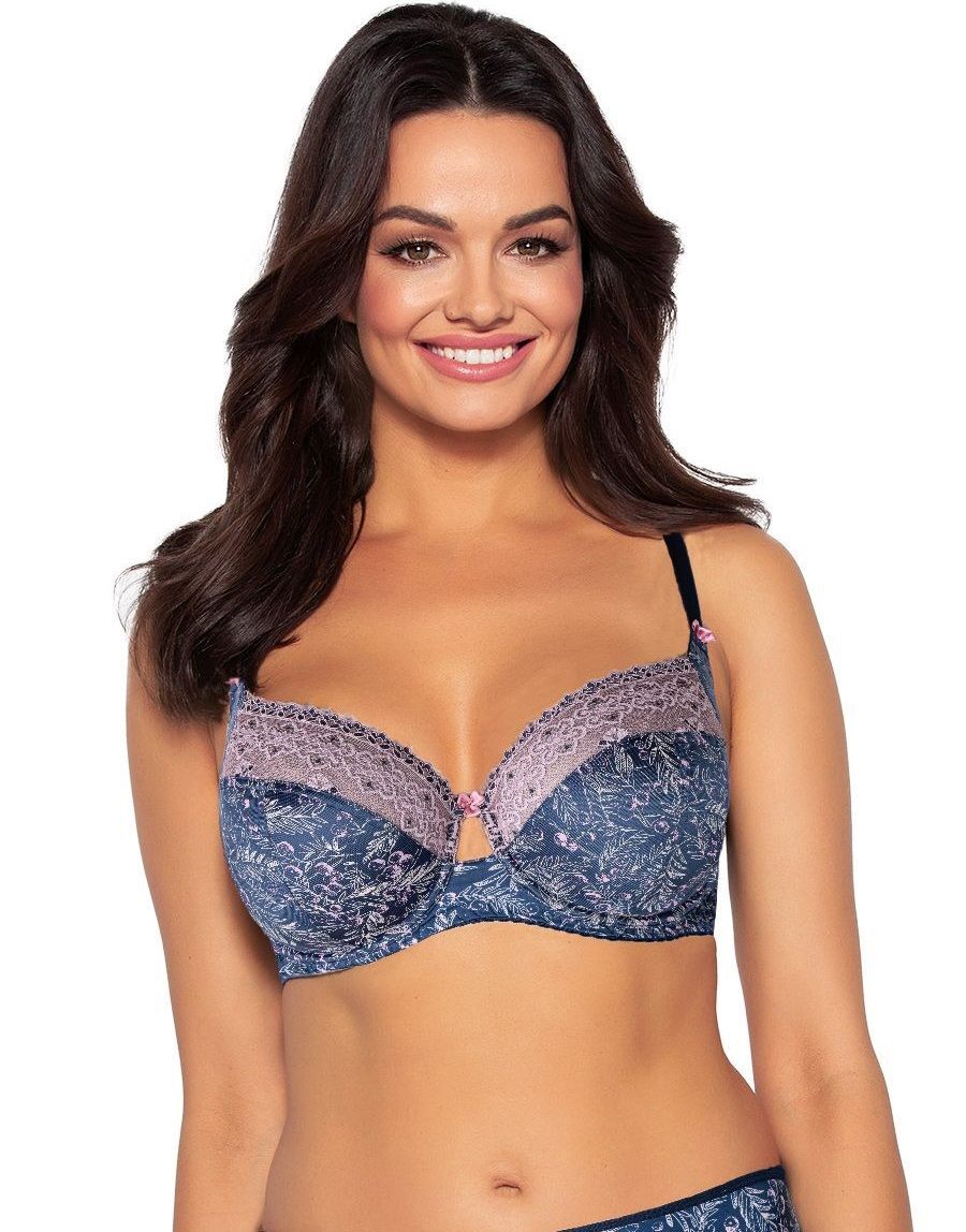 Представляем бюстгальтер с мягкой чашкой, который сочетает в себе комфорт и элегантность. Этот бюстгальтер выполнен из высококачественного трикотажа с растительным рисунком, что придаёт ему уникальный и привлекательный вид. Темно-синий цвет с ажурными вставками светло-розового оттенка делает его идеальным выбором для женщин, которые ценят как стиль, так и удобство.