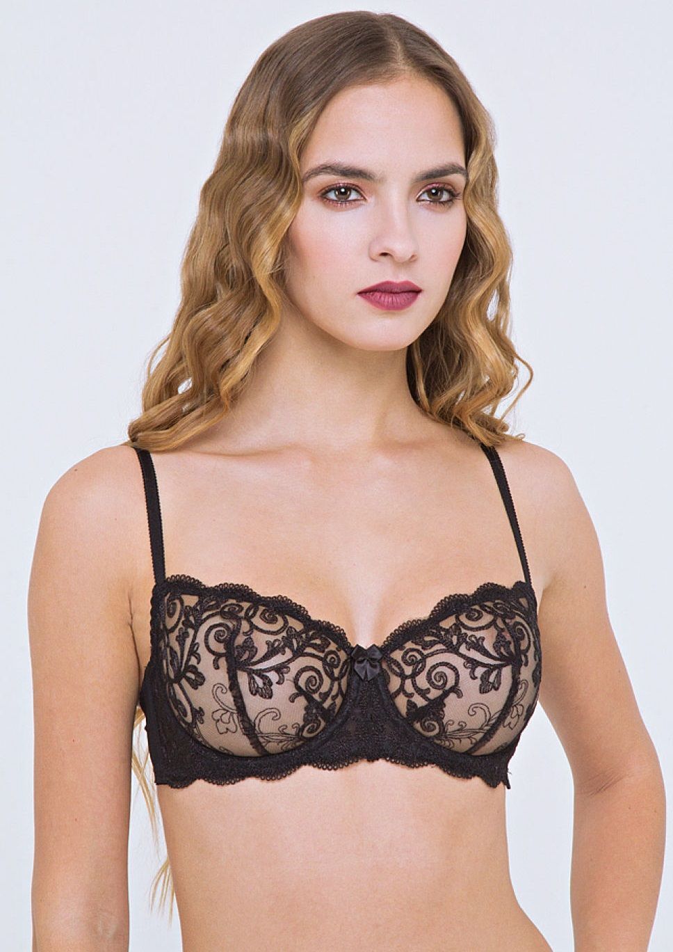 Состав из 85% полиамида и 15% эластана обеспечивает мягкое облегание без эффекта сдавливания. Специальное плетение сетки предотвращает образование катышков при длительной эксплуатации. Изогнутая линия верха чашек визуально корректирует силуэт, создавая эффект соблазнительного декольте.