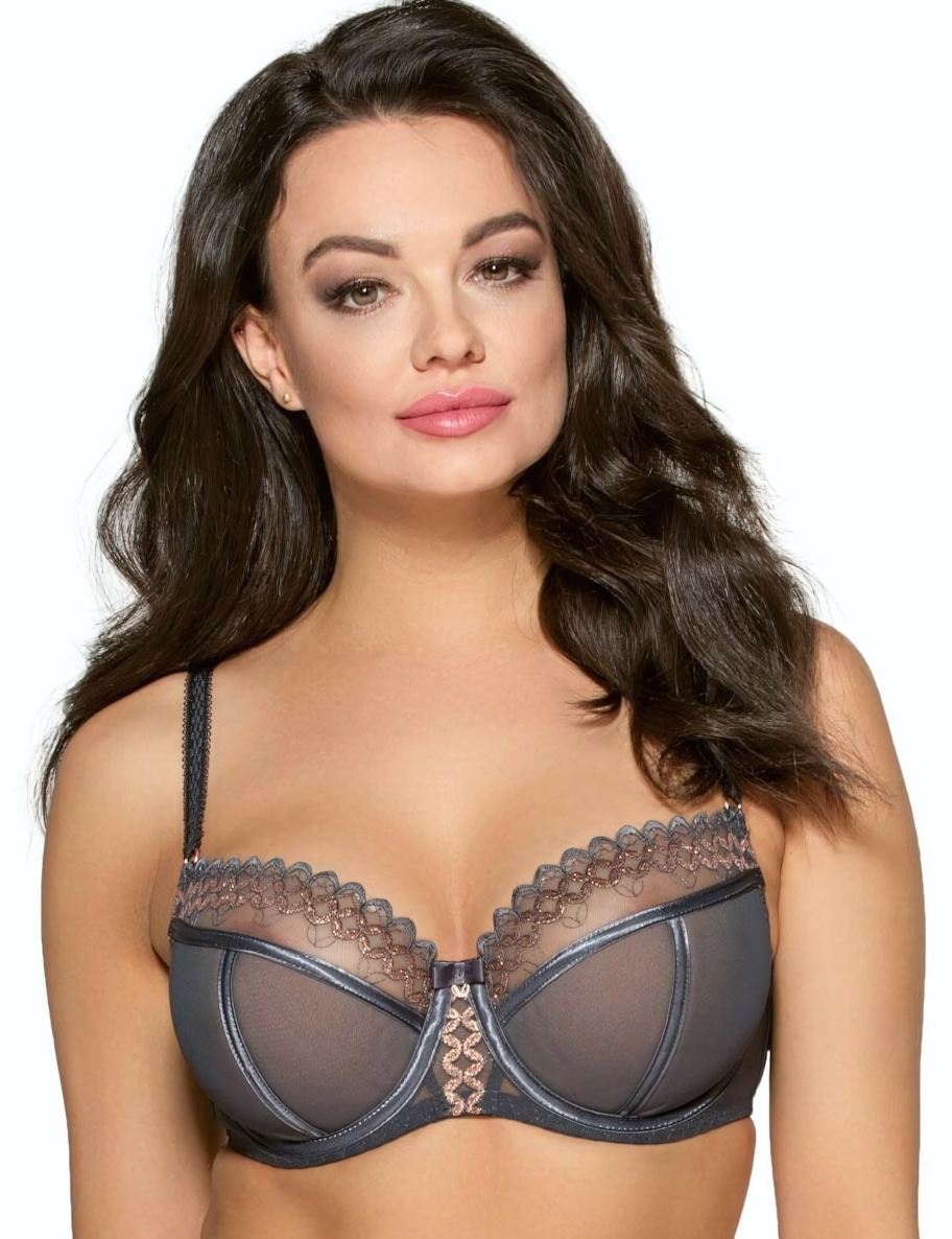 Материал: 88% полиамид, 8% хлопок, 4% эластан. Чашки выполнены из сетки графитово-серого цвета с декоративной окантовкой атласными лентами.