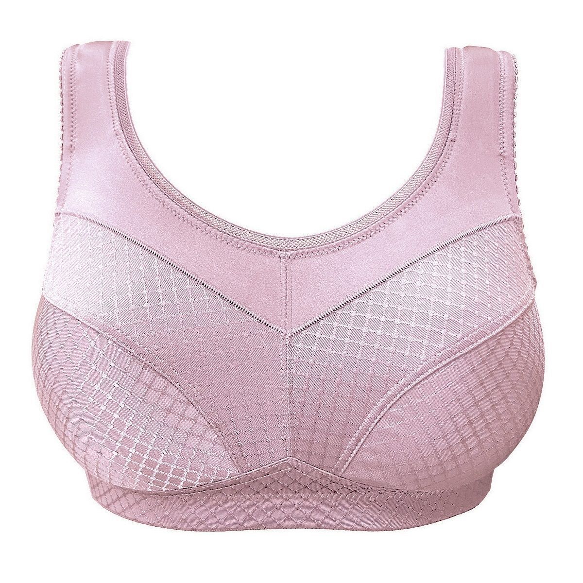 Бюстгальтер выполнен из эластичного шелковистого полотна с жаккардовым геометрическим орнаментом, что придаёт ему не только стильный вид, но и комфортную посадку. Широкие неэластичные бретели на мягкой подкладке обеспечивают надежную поддержку, а регулируемые элементы на спинке позволяют подстроить бюстгальтер под индивидуальные параметры фигуры. Вертикальные косточки на боковых панелях предотвращают скручивание ткани, что особенно важно для больших размеров.