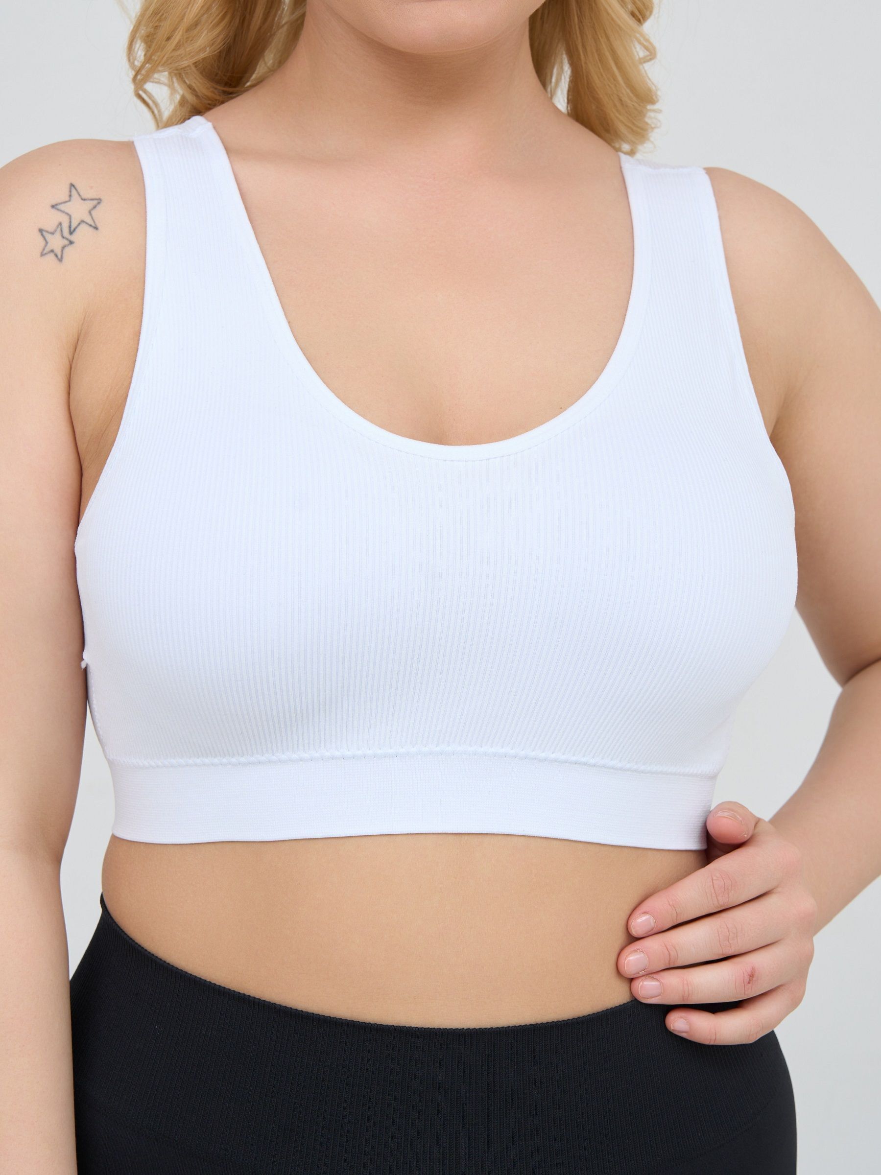 Рёбрышко ткани создаёт эффект стройного силуэта, а глубокий вырез подчёркивает женственность. Широкие бретели равномерно распределяют нагрузку, предотвращая дискомфорт при длительном ношении. Модель XL размера идеально подходит для повседневной носки под одежду с открытым вырезом.