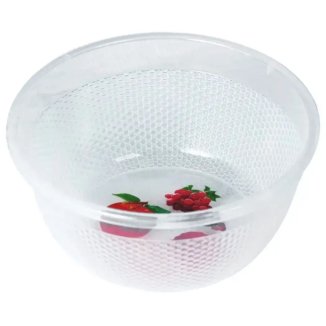 Прозрачная пластиковая чаша объемом 2 литра сочетает функциональность и эстетику. Идеальный выбор для хранения продуктов, сервировки фруктов или приготовления салатов. Текстурированные стенки обеспечивают удобный захват, а оригинальный декор с ягодами добавит яркий акцент на вашем столе.