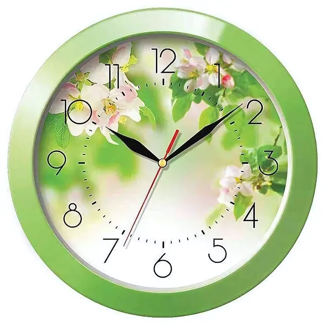 Элегантные аналоговые часы с цветочным орнаментом создадут уютную атмосферу и подчеркнут ваш вкус. Мягкий градиентный зеленый фон гармонично сочетается с любым стилем оформления — от классики до современного минимализма.