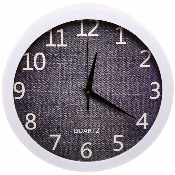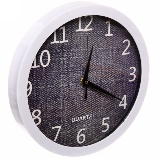 Часы выполнены из качественного пластика, что обеспечивает их долговечность и легкость. Циферблат украшен текстурой, имитирующей джинсовую ткань, что придает им уникальный вид. Черные стрелки на циферблате контрастируют с белыми цифрами, а надпись «QUARTZ» в нижней части подчеркивает высокое качество механизма. Эти часы станут не только функциональным элементом, но и стильным дополнением вашего дома.
