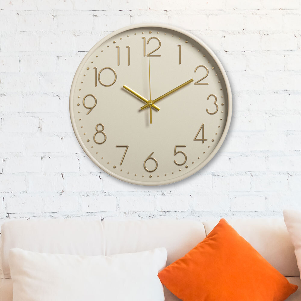 Корпус выполнен в светло-бежевых тонах, подходит как к теплым, так и к холодным цветовым схемам интерьера. Циферблат украшен золотистыми цифрами и лаконичными точечными отметками, что делает часы не только функцией, но и акцентом декора. Поставляются в картонной коробке, удобно дарить и хранить.