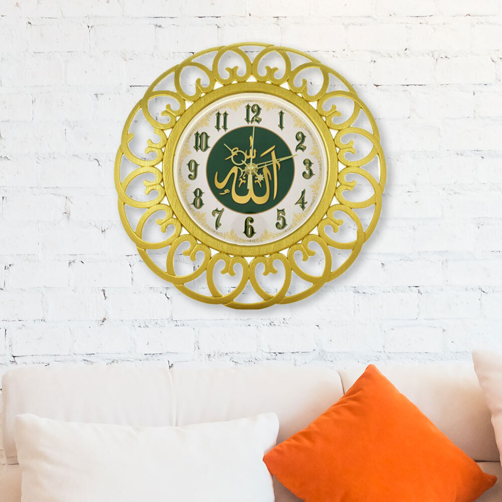 Часы подходят для установки на любую гладкую стену и легко сочетаются с различным интерьером благодаря золотистому цвету и каллиграфическому дизайну.
