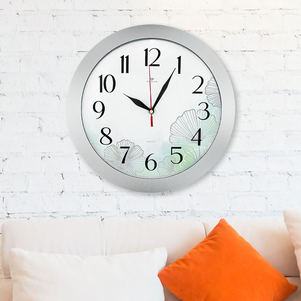 Добавьте в интерьер чувство уюта и гармонии с круглыми настенными часами диаметром 31см, оформленными стильным серебристым корпусом и белым циферблатом. Рисунок листьев на циферблате не только создает приятную атмосферу, но и привносит свежесть и природные мотивы в ваш дом. Четкие арабские цифры, контрастные стрелки — время читается легко, даже с расстояния.
