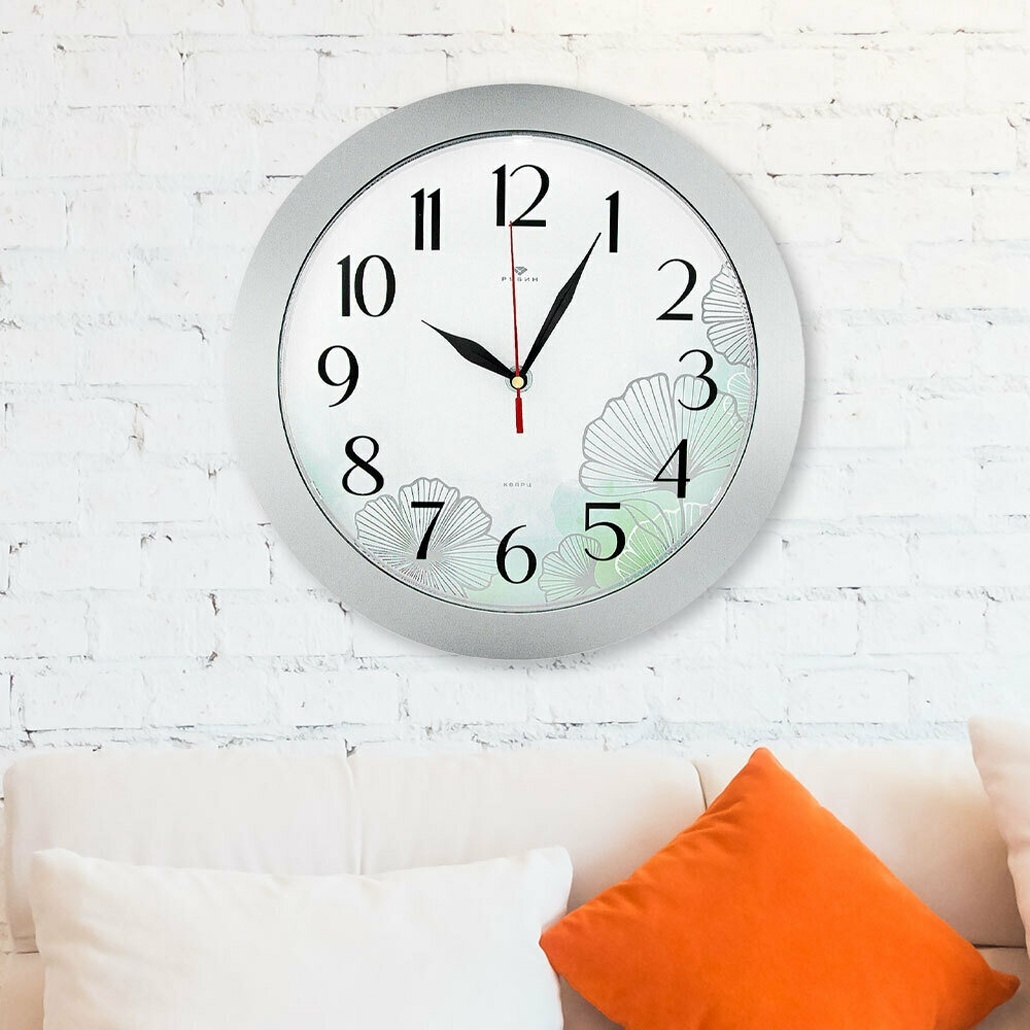Часы настенные круглые d31см, серебристый корпус, белый циферблат, рисунок листья, комфорт и стиль для интерьера