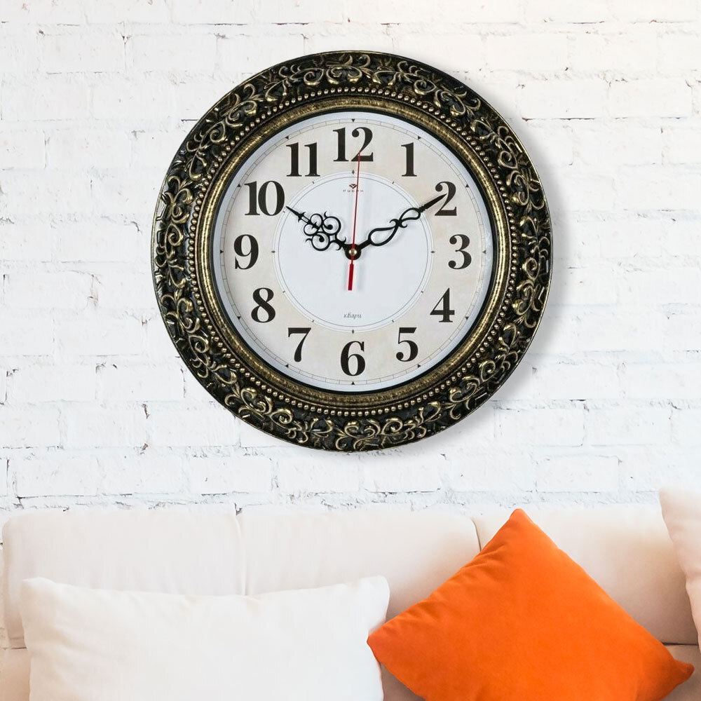 Настенные часы диаметром 35см с черным корпусом и декоративным золотым узором создают атмосферу уюта и отличного вкуса в любом помещении. Их сдержанный стиль и гармоничное сочетание оттенков делают часы изюминкой классического и современного интерьера.