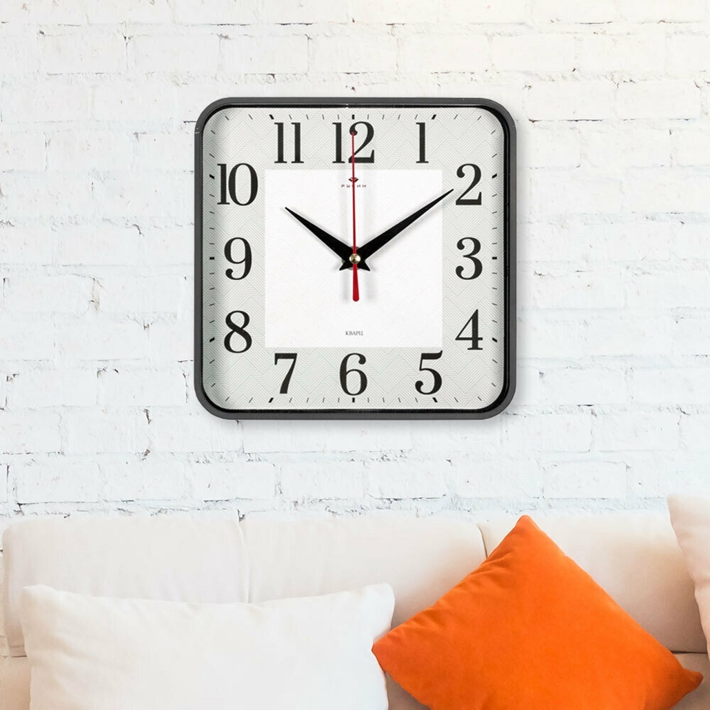 Корпус часов выполнен в черном/сером цвете — гармонирует с любыми оттенками стен, мебели. Бело-серый циферблат хорошо читается, стрелки выделяются для четкости. Размер 19x19 см позволяет разместить часы даже на ограниченной площади, не перегружая интерьер.