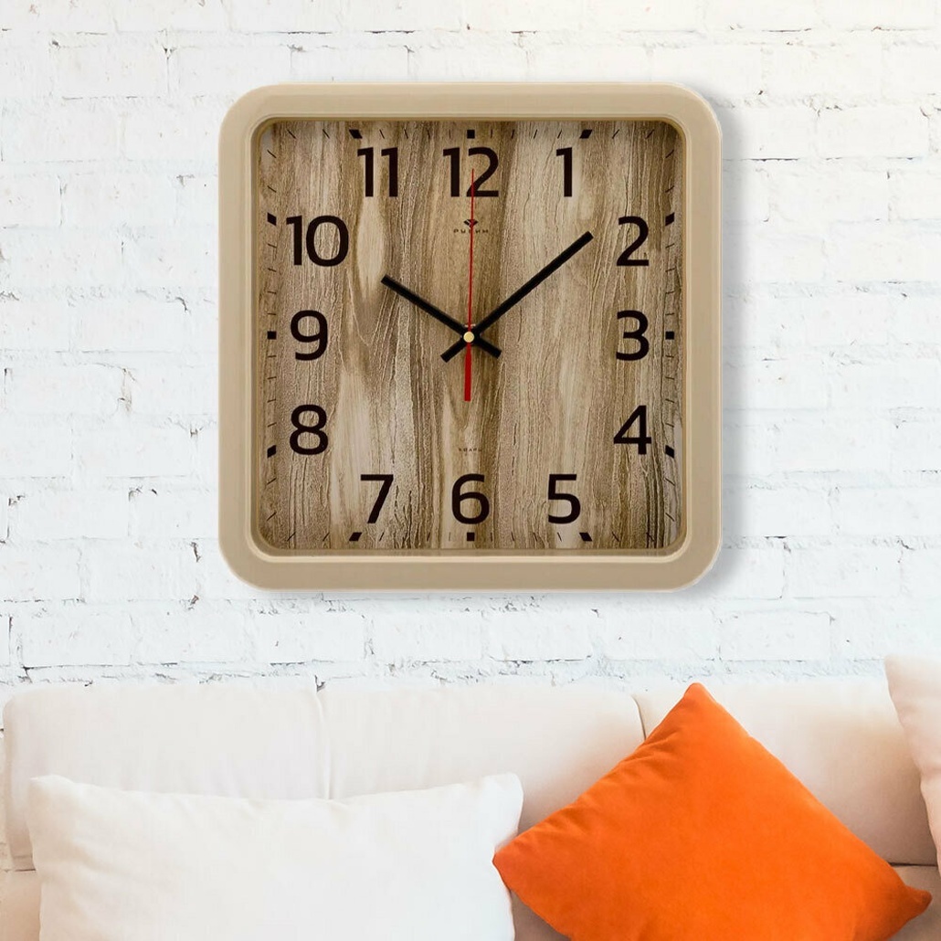Оцените гармонию стиля и практичности с квадратными настенными часами с корпусом бежевого цвета и циферблатом под текстуру натурального дерева. Их теплый оттенок и реалистичное изображение древесных волокон создают атмосферу уюта, подчеркивают современный интерьер и делают пространство комфортнее. Черные стрелки и яркая красная секундная легко выделяются и позволяют без труда считывать время даже издалека.