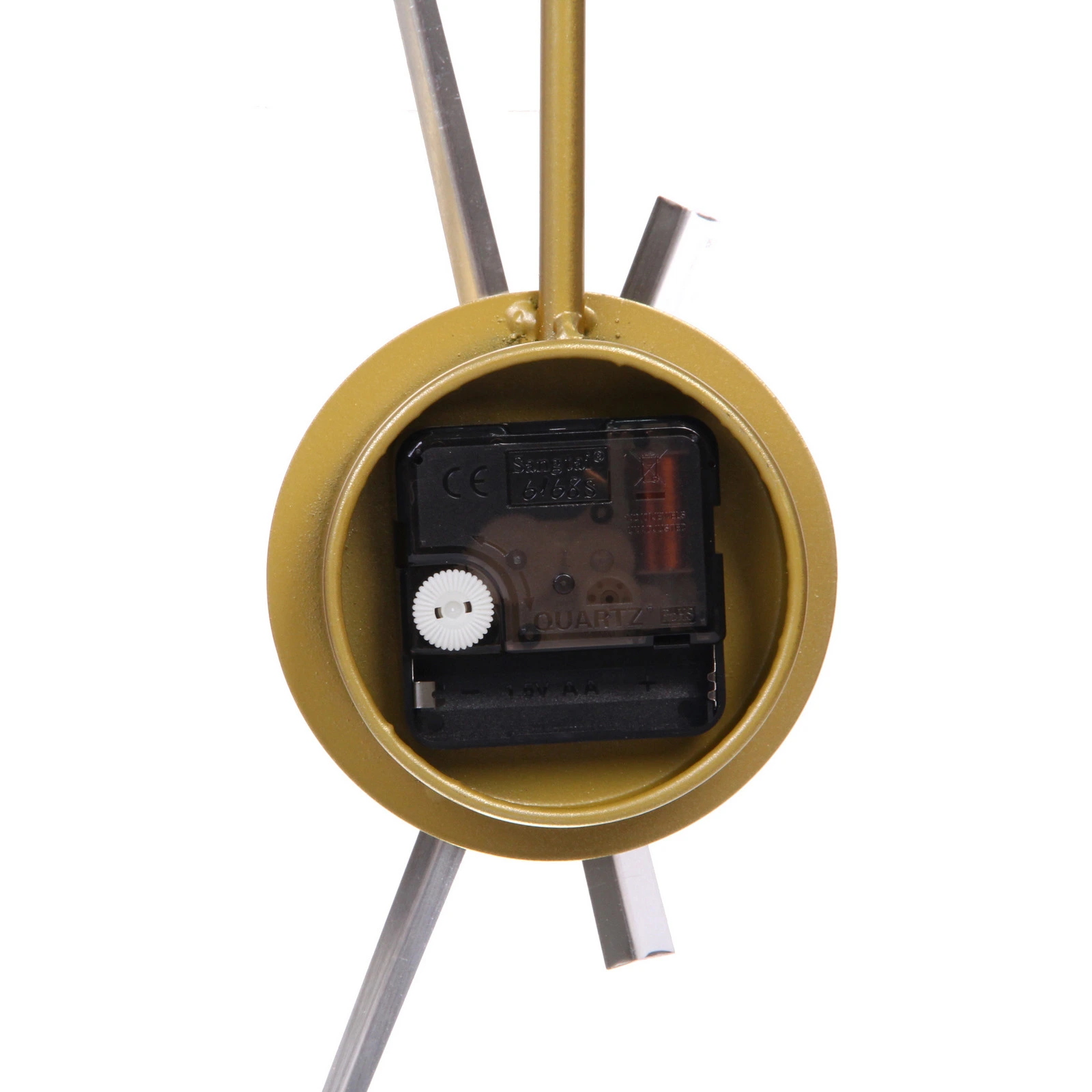Часы имеют крупный формат 60х60 см, что позволяет им быть заметным элементом декора даже в просторном помещении. Корпус и декоративные элементы выполнены из металла с матово-золотистым покрытием, которое устойчиво к выцветанию. Для работы требуется одна батарейка типа АА (в комплект не входит).