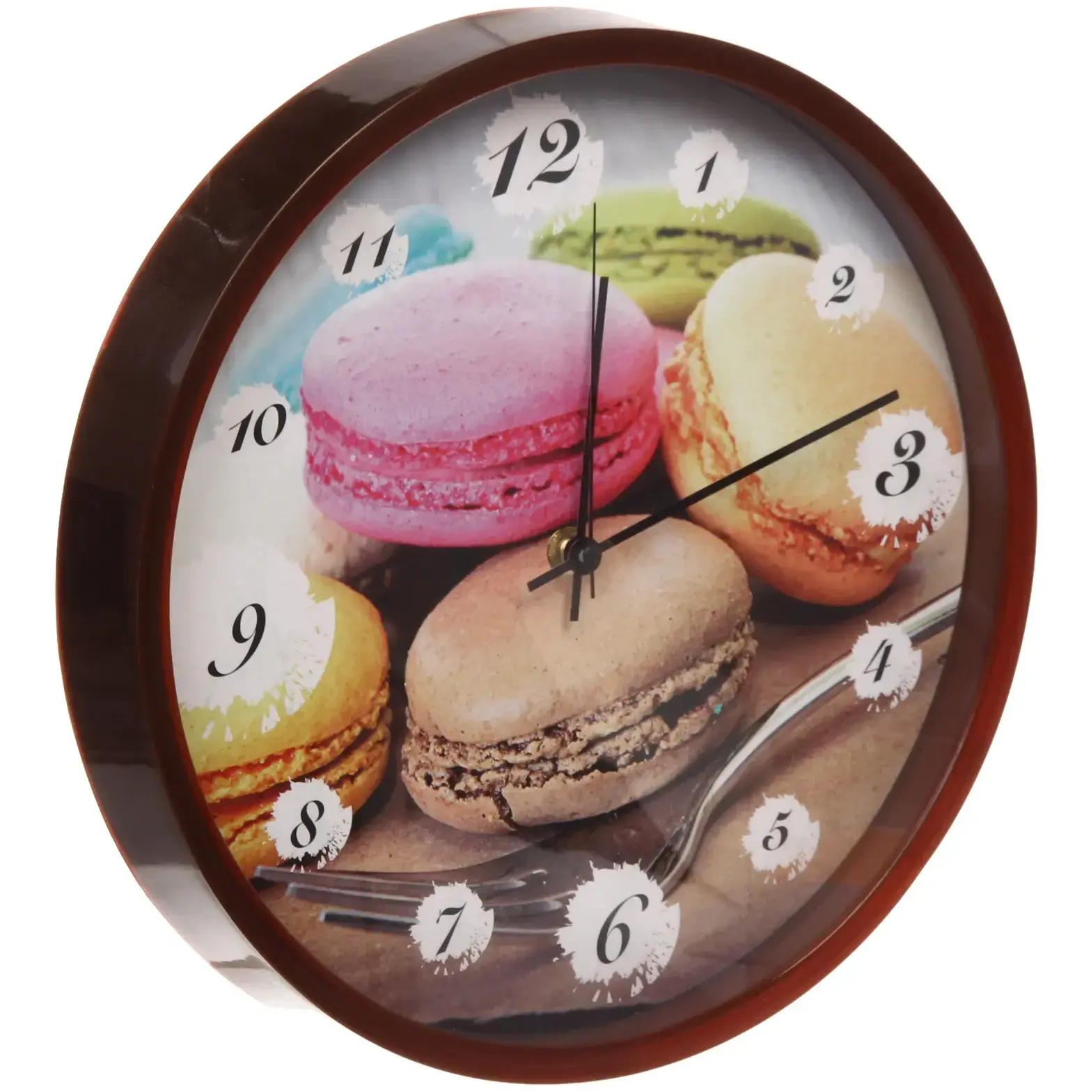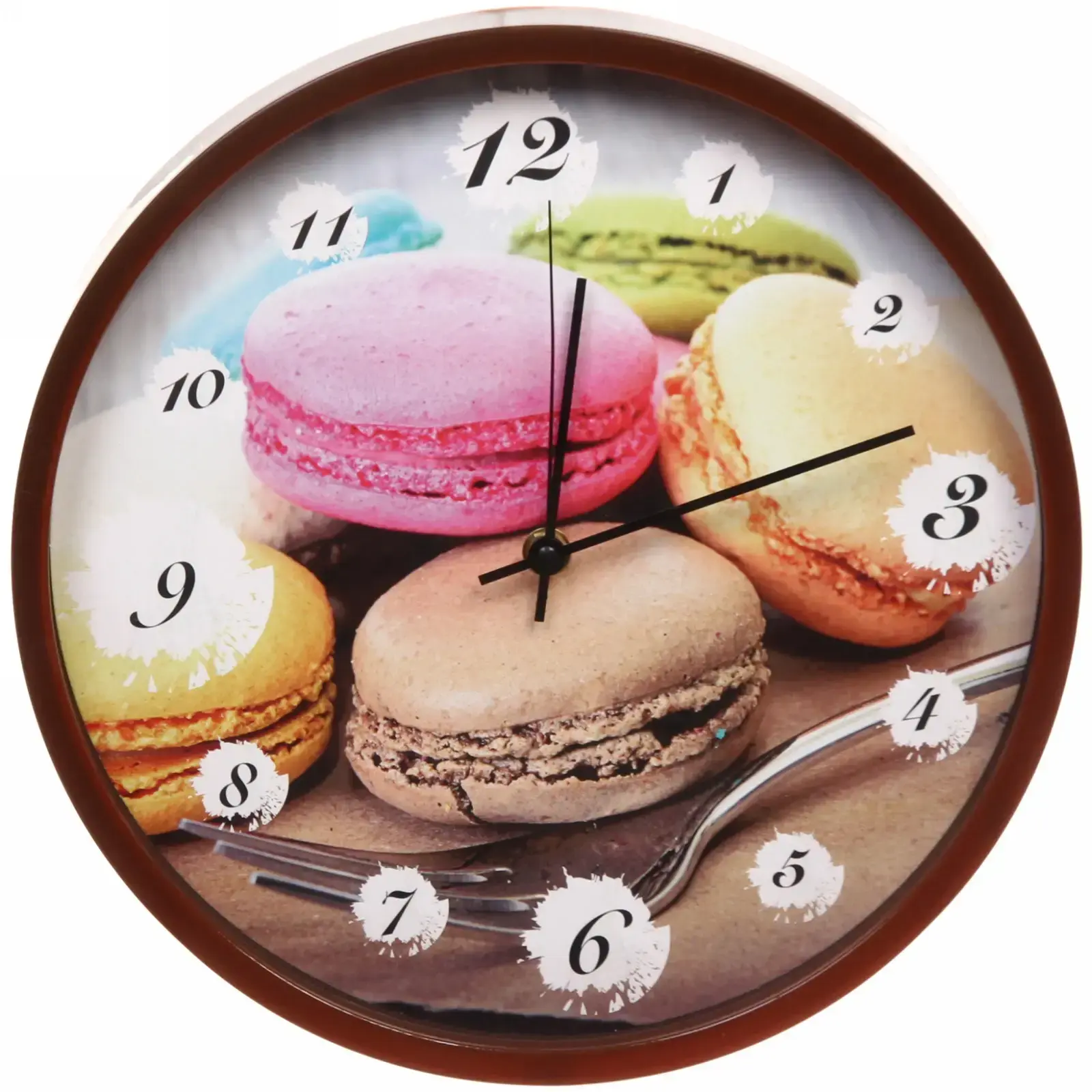 Эти настенные часы не только показывают время, но и становятся ярким элементом декора, который придаст вашему пространству утонченный вид. С их помощью вы сможете создать уютную атмосферу в кухне, гостиной или спальне. Часы выполнены в современном стиле и оформлены изображением аппетитных макарун, что делает их идеальным выбором для любителей кулинарии и эстетики.