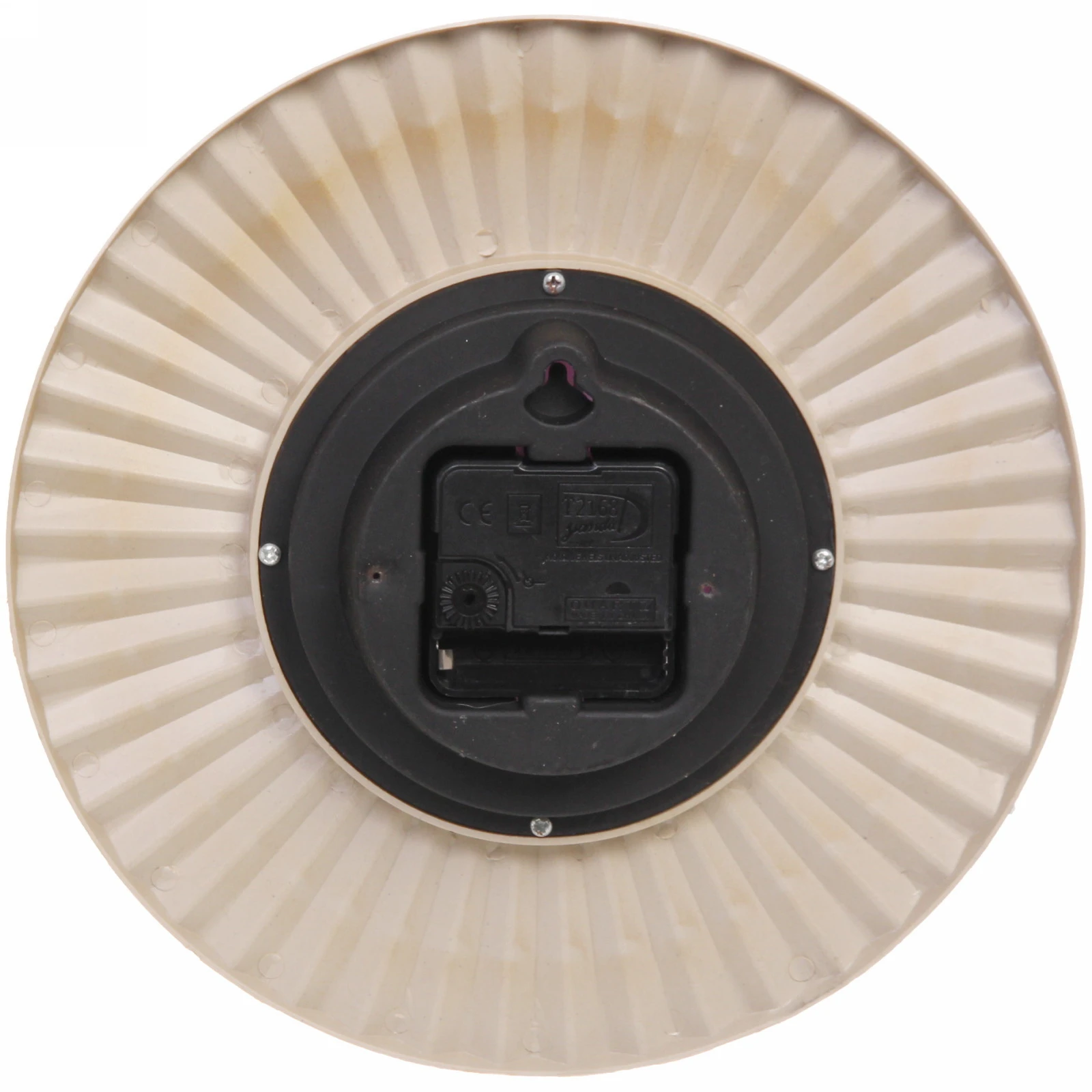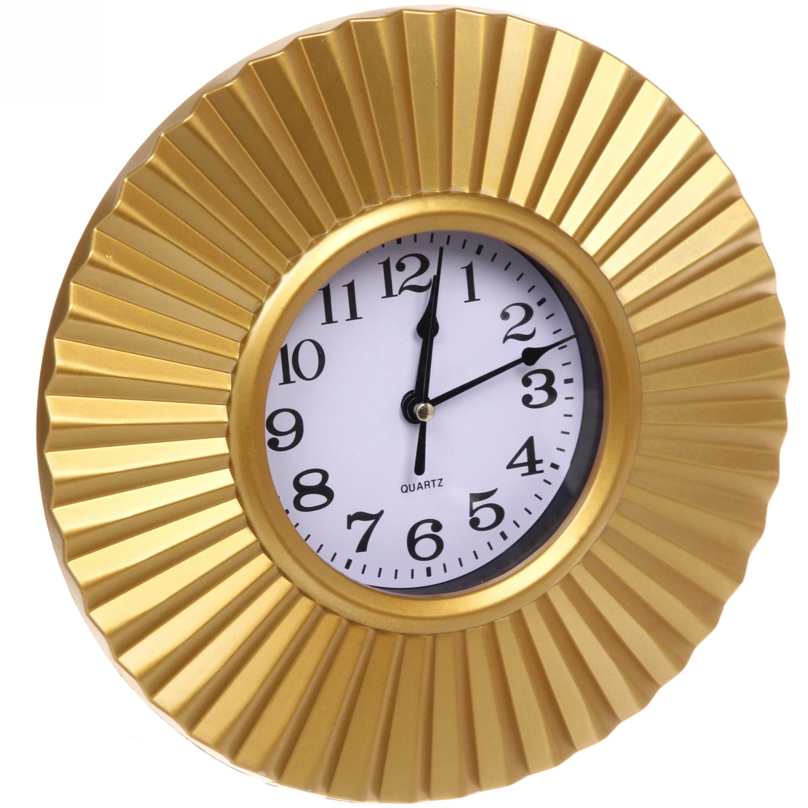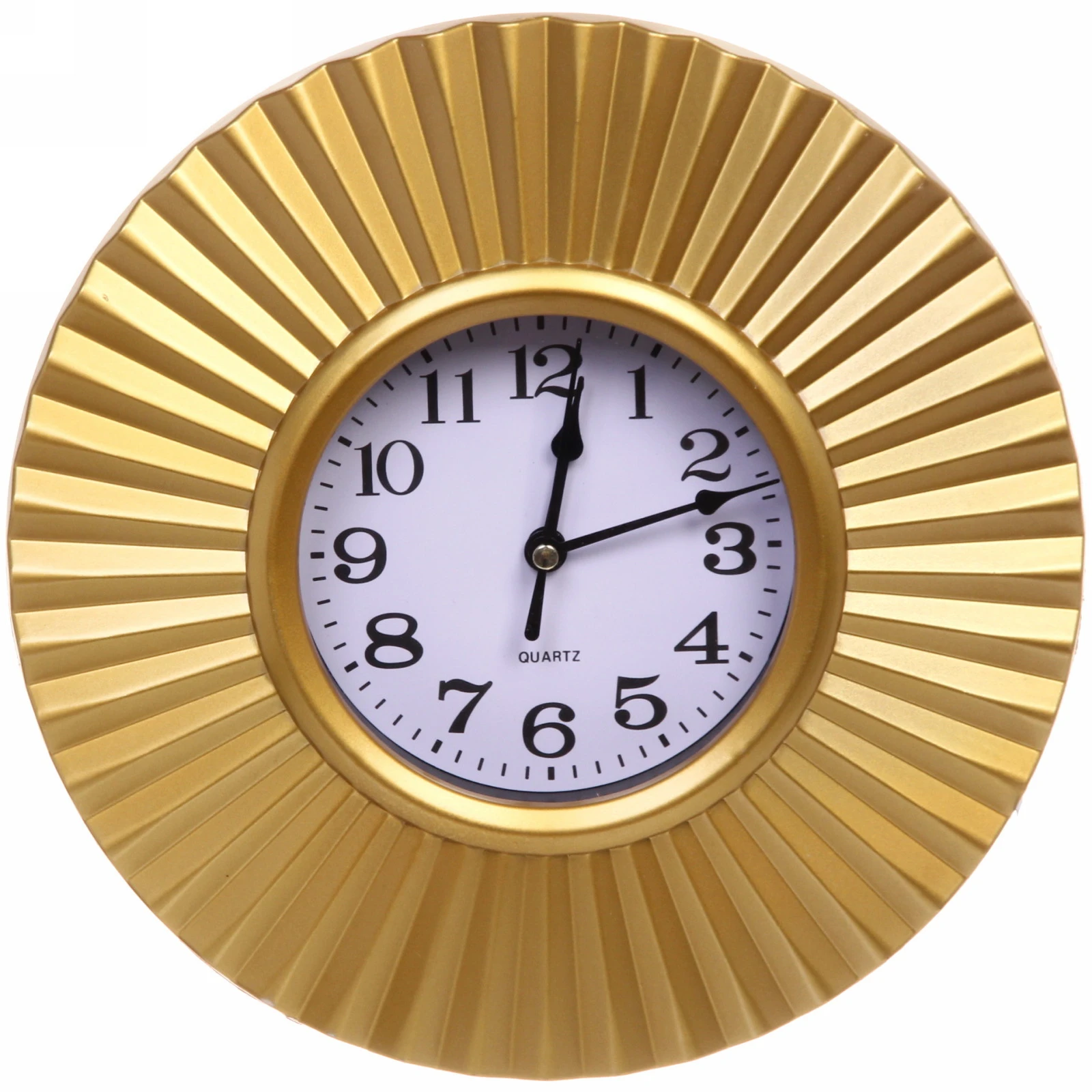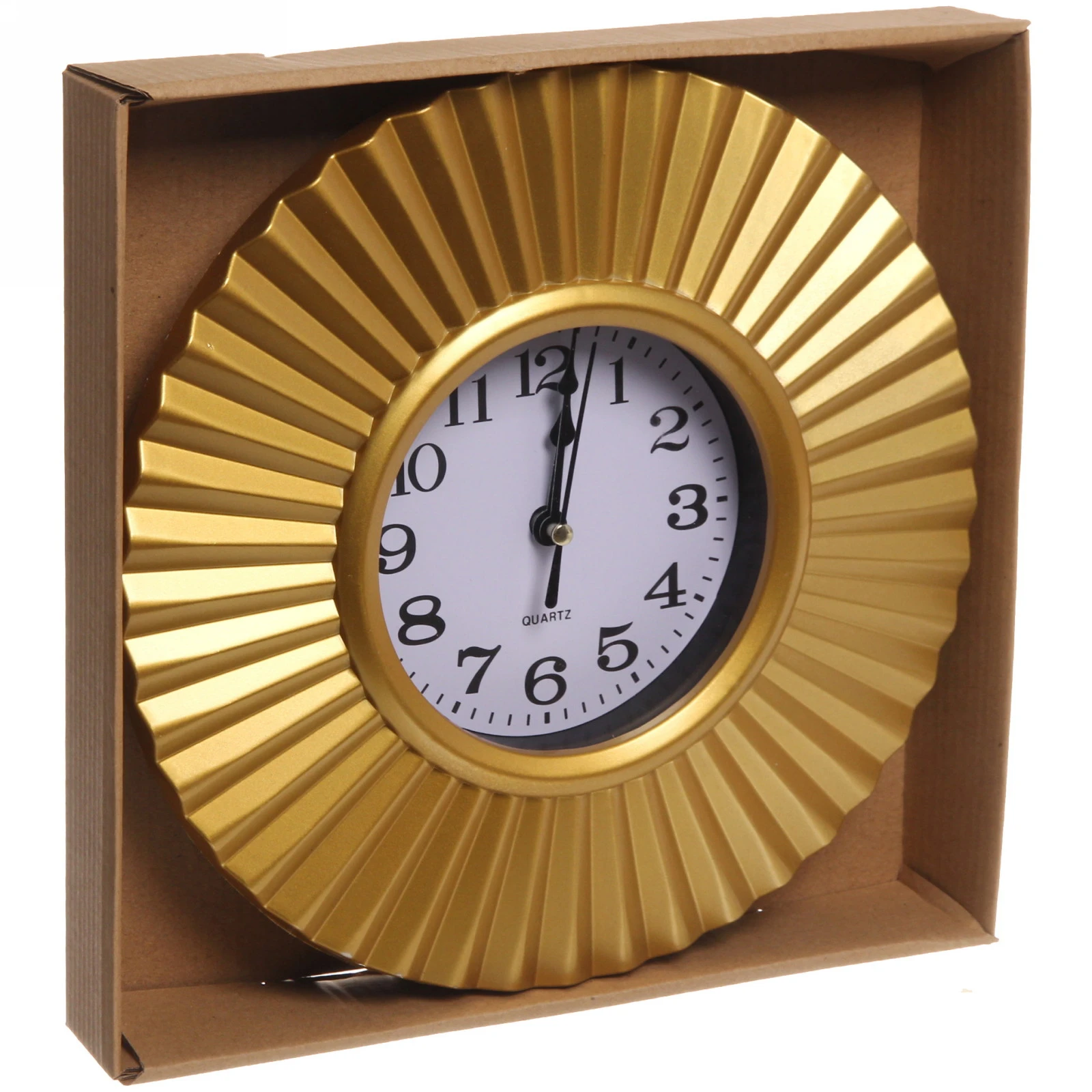 - Выразительный дизайн: Широкий золотистый обод с рельефными радиальными полосами создает эффект объема и роскоши. Контрастный белый циферблат с крупными арабскими цифрами гарантирует отличную читаемость времени с любого расстояния.