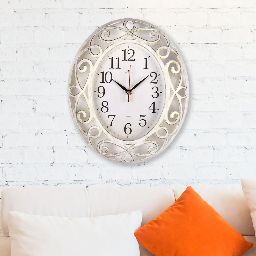 Часы настенные овальные классика 31x26см, корпус белый с золотым, арабские цифры, кварцевый механизм, для гостиной