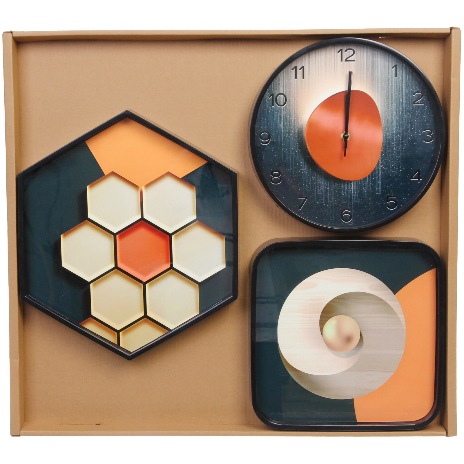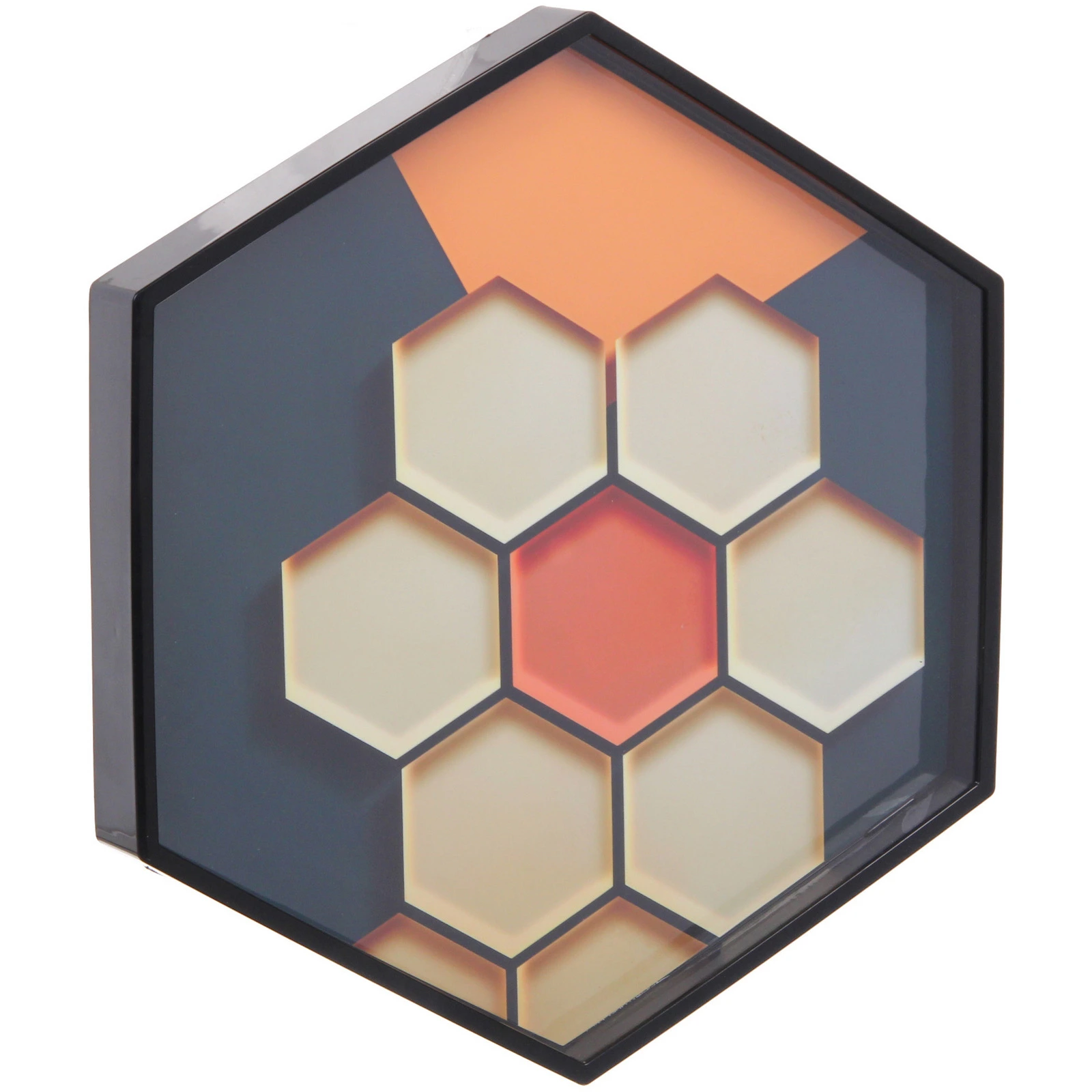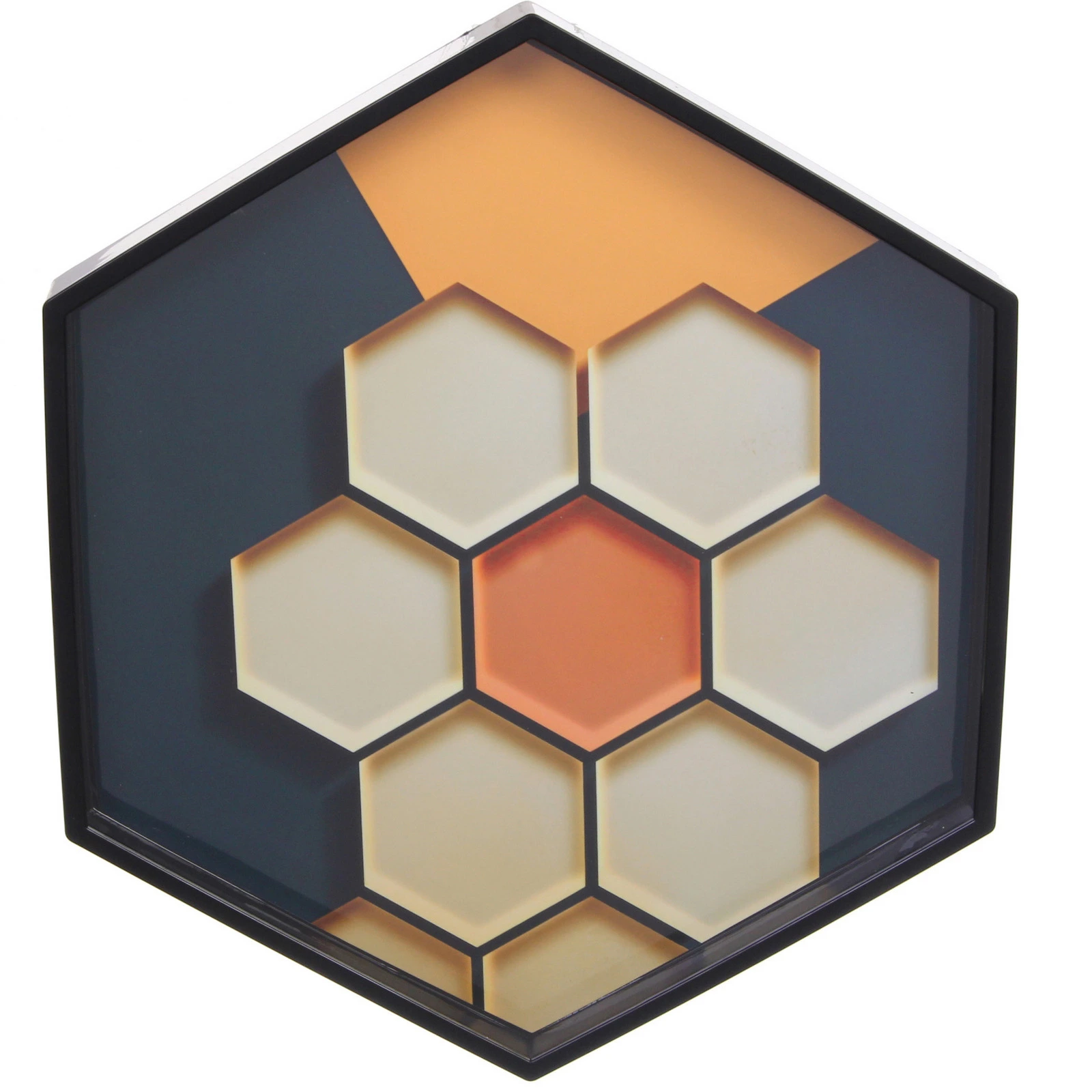 - Декоративное панно шестиугольной формы («соты») с композицией из семи шестиугольников. Центральный элемент оранжевого цвета окружен светлыми модулями на темном фоне с оранжевыми плоскостями.