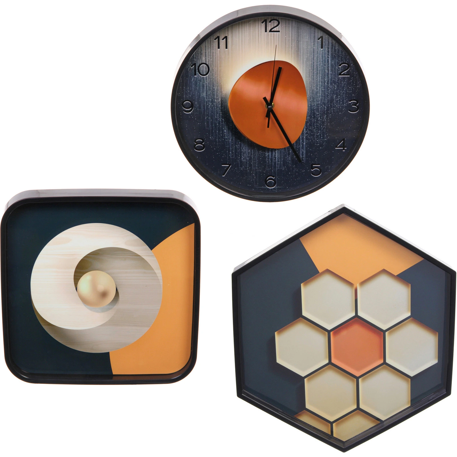 Создайте целостную композицию на стене, расположив часы как центральный элемент, а панно — по бокам или в свободном порядке. Шестиугольное и квадратное панно также можно использовать отдельно, например, для оформления пустующего уголка или зонирования пространства.