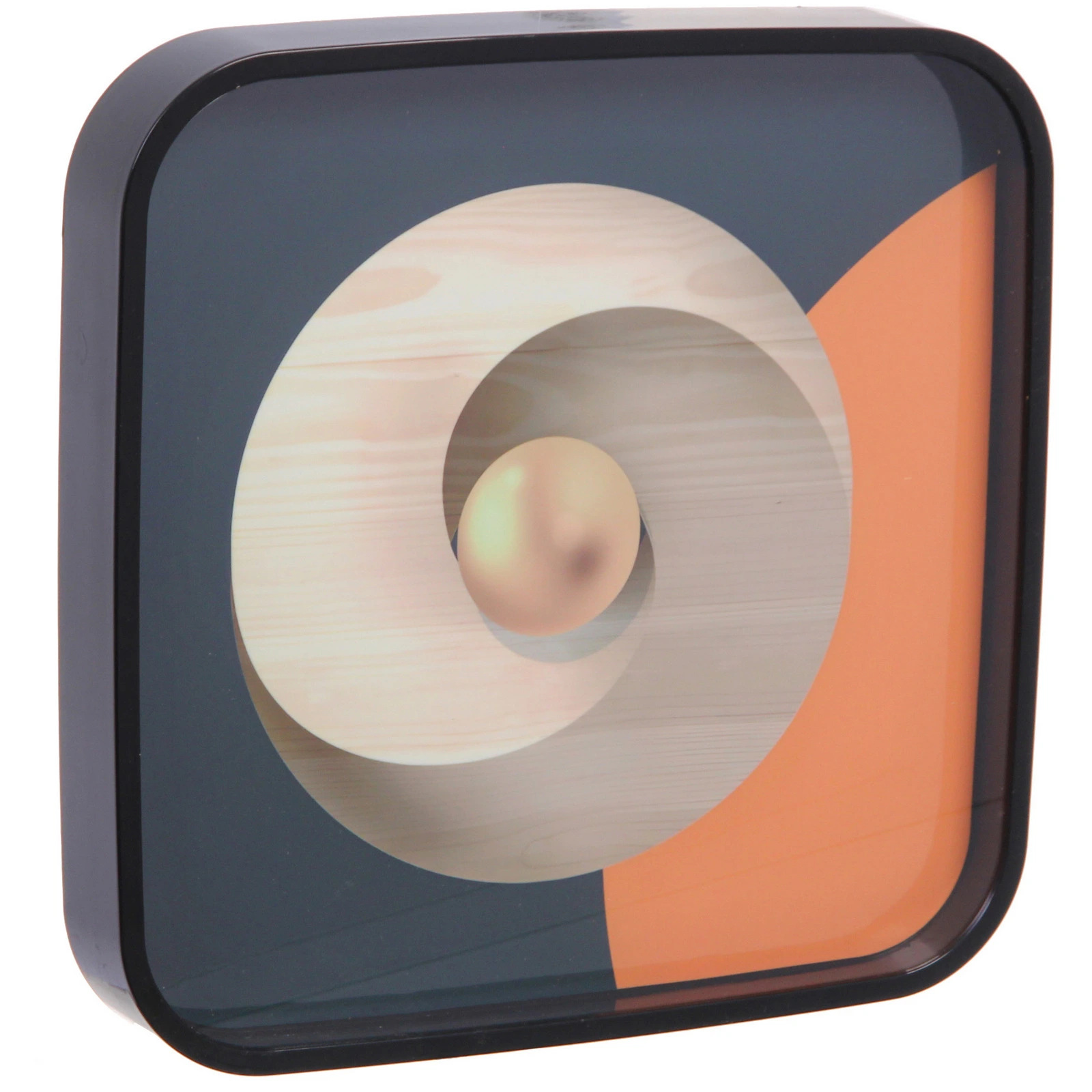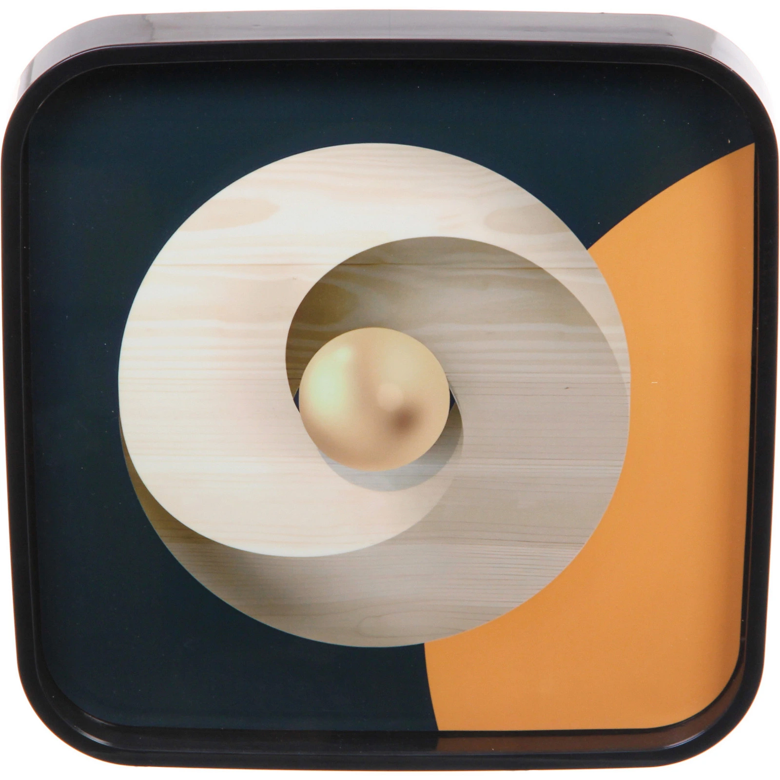 - Декоративное панно квадратной формы со спиралевидным узором светлых оттенков и золотистым шарообразным элементом в центре на контрастном темном фоне с оранжевым сектором.