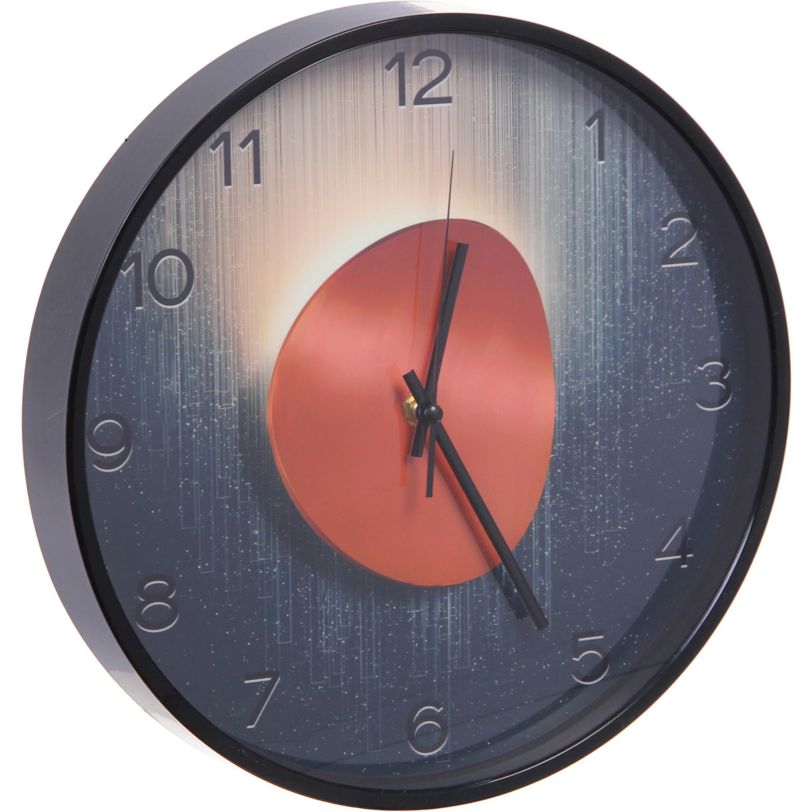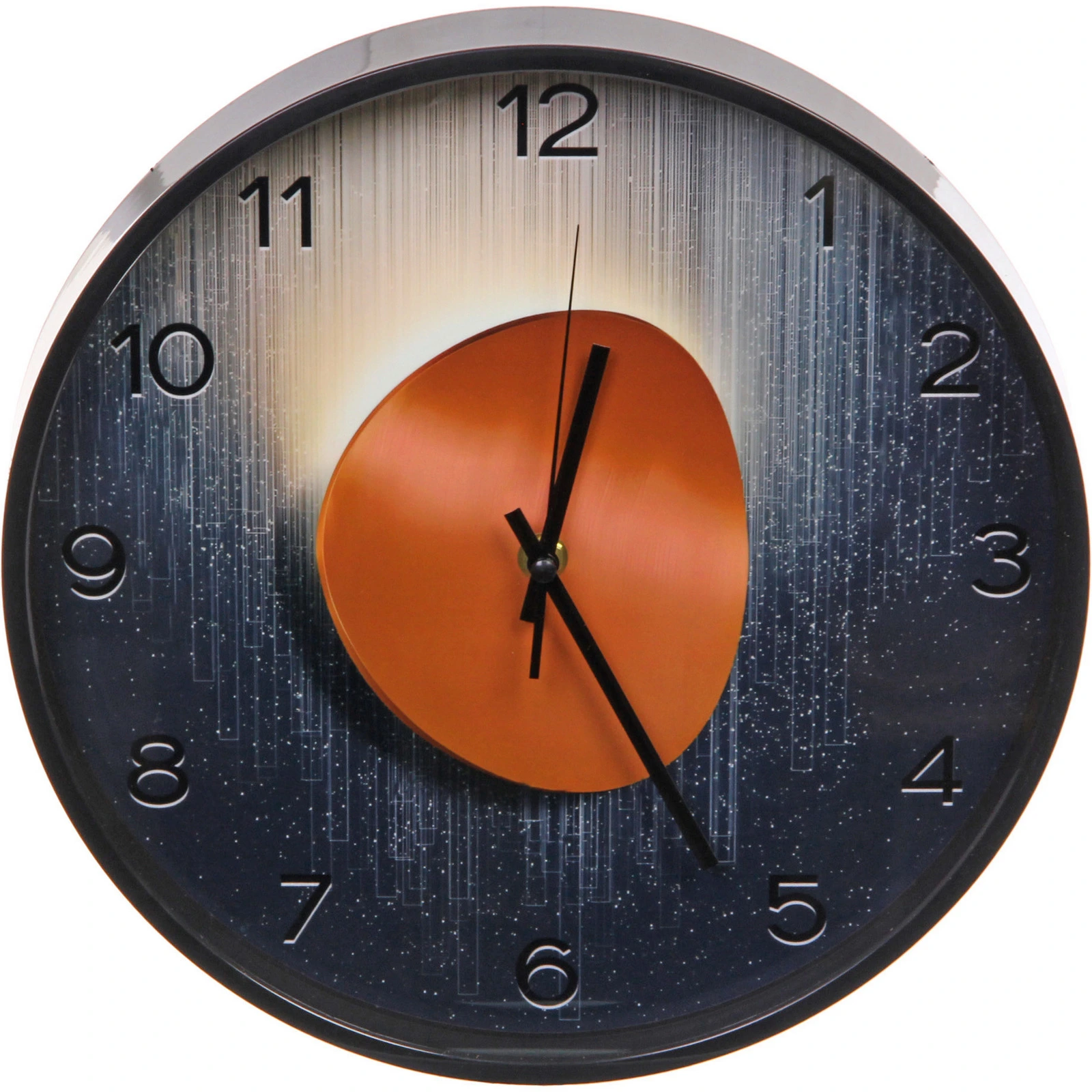- Настенные часы круглой формы с циферблатом в темных тонах, светлыми вертикальными линиями и выразительным оранжевым акцентом в центре. Арабские цифры и тонкие стрелки обеспечивают хорошую читаемость.