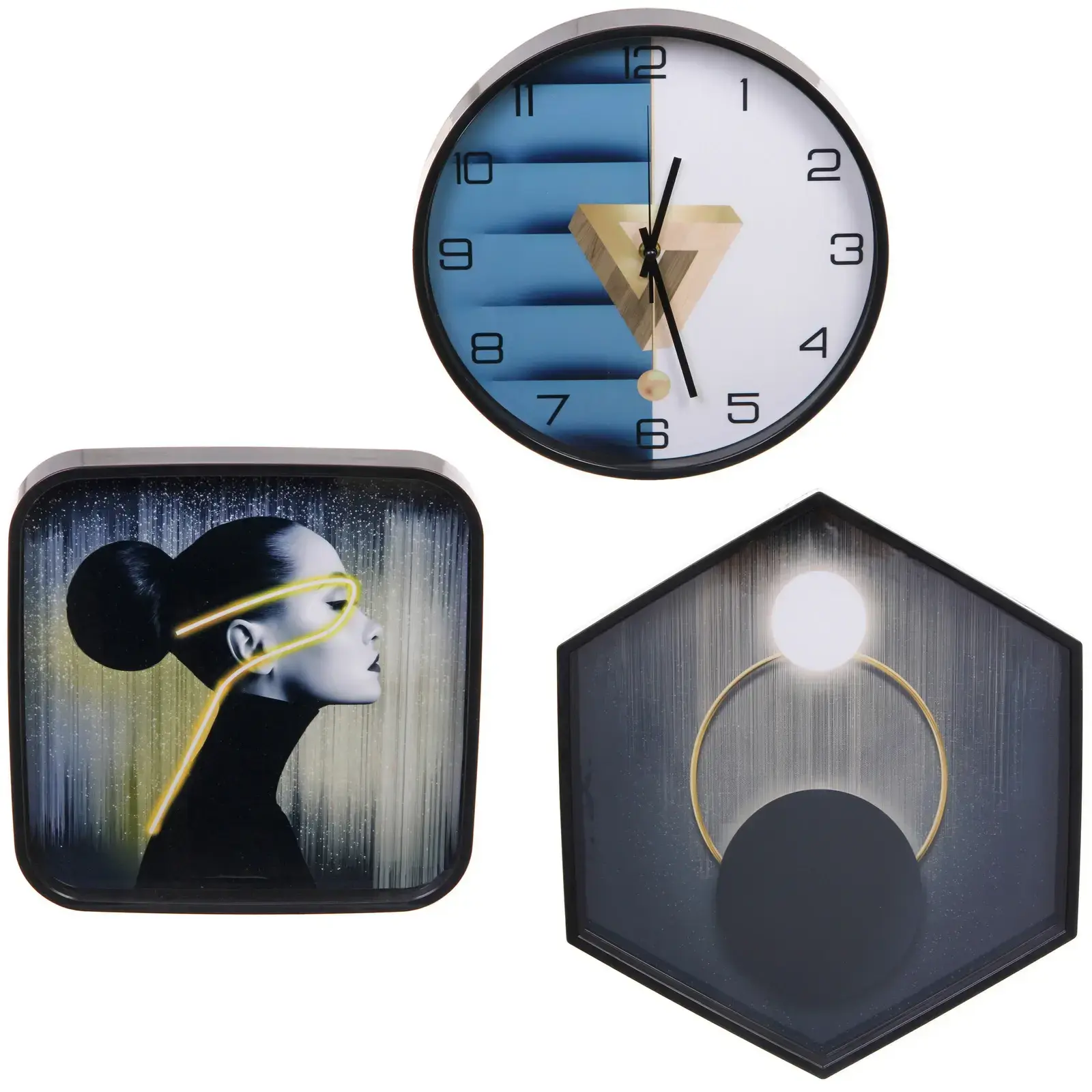 Комплект поставляется с крепежными элементами для быстрого монтажа. Габариты часов: диаметр 30 см, панно: 25×25 см и 28 см по диагонали. Вес каждого элемента не превышает 800 г — можно размещать на гипсокартонных стенах.