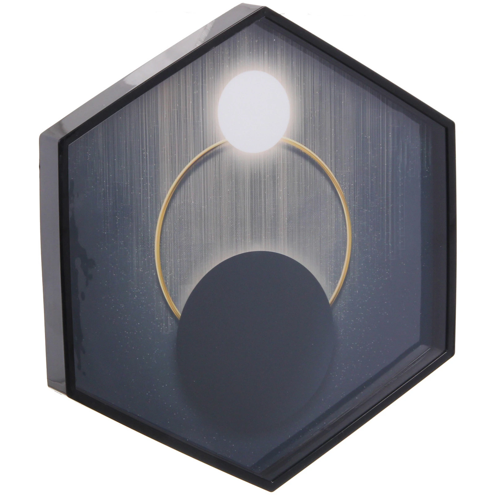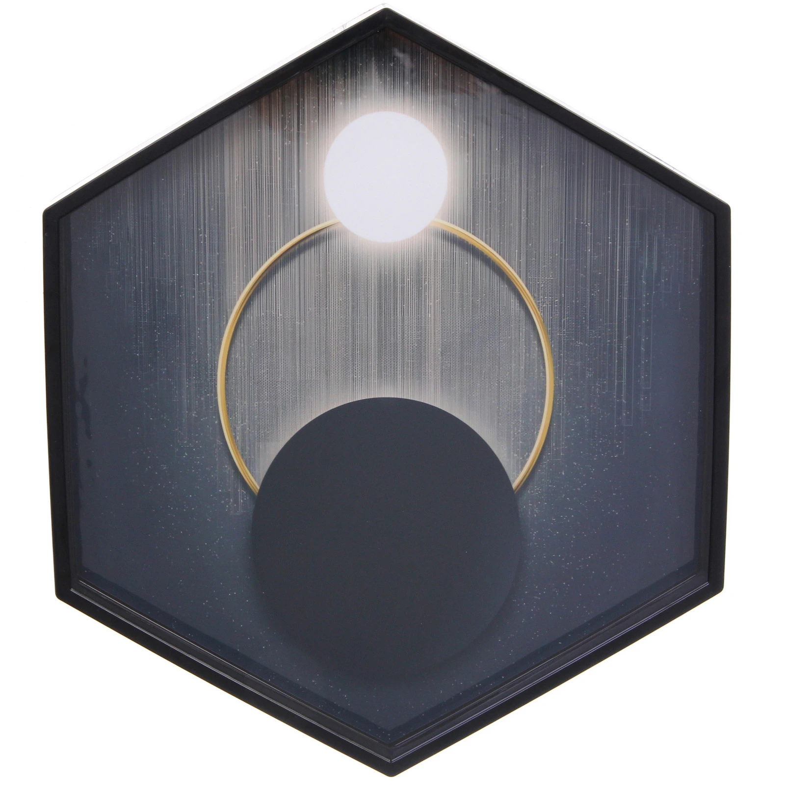 - Панно пятиугольной (домикообразной) формы с абстрактной композицией. Сочетание светящегося круга, золотистого кольца и темного элемента создает загадочную и современную атмосферу.