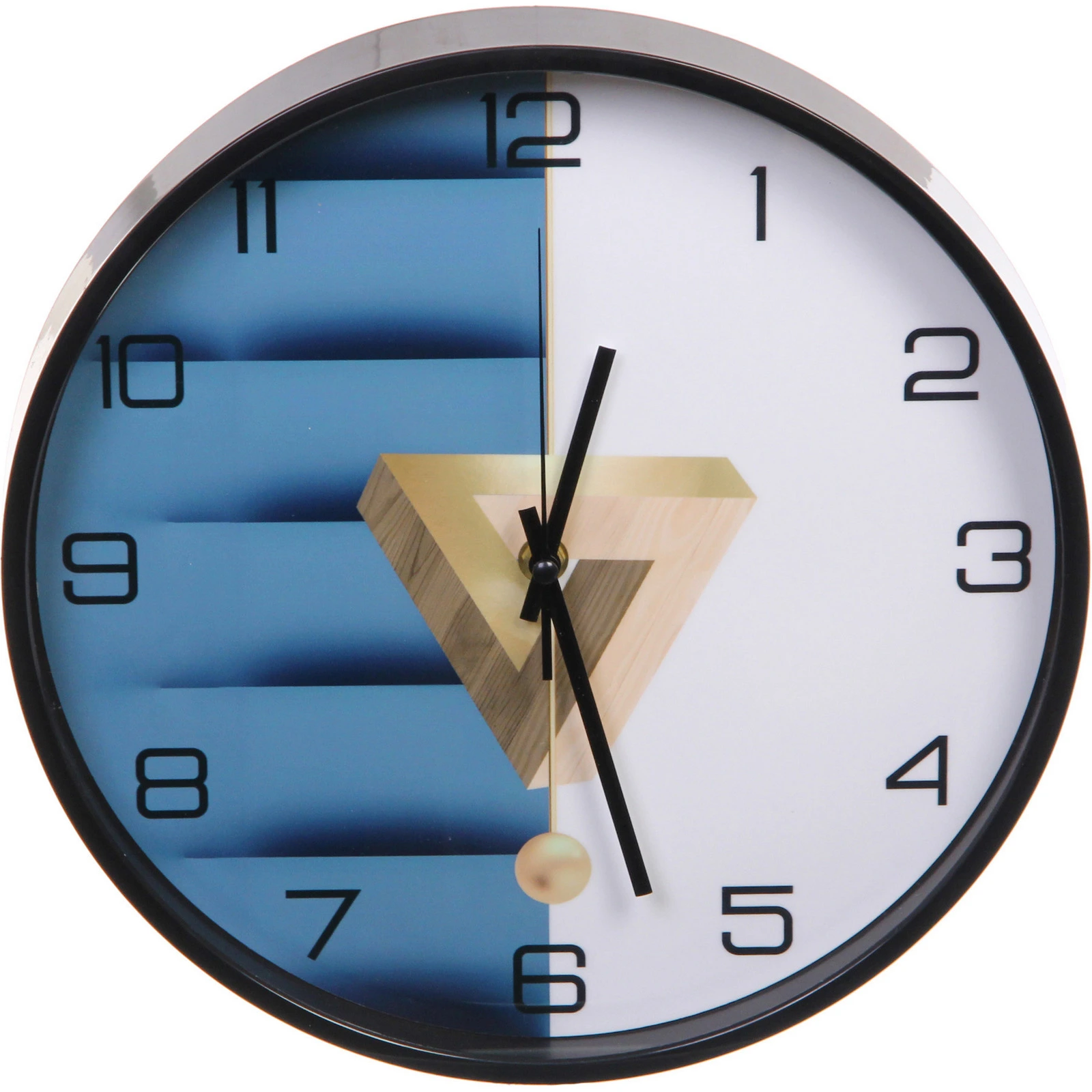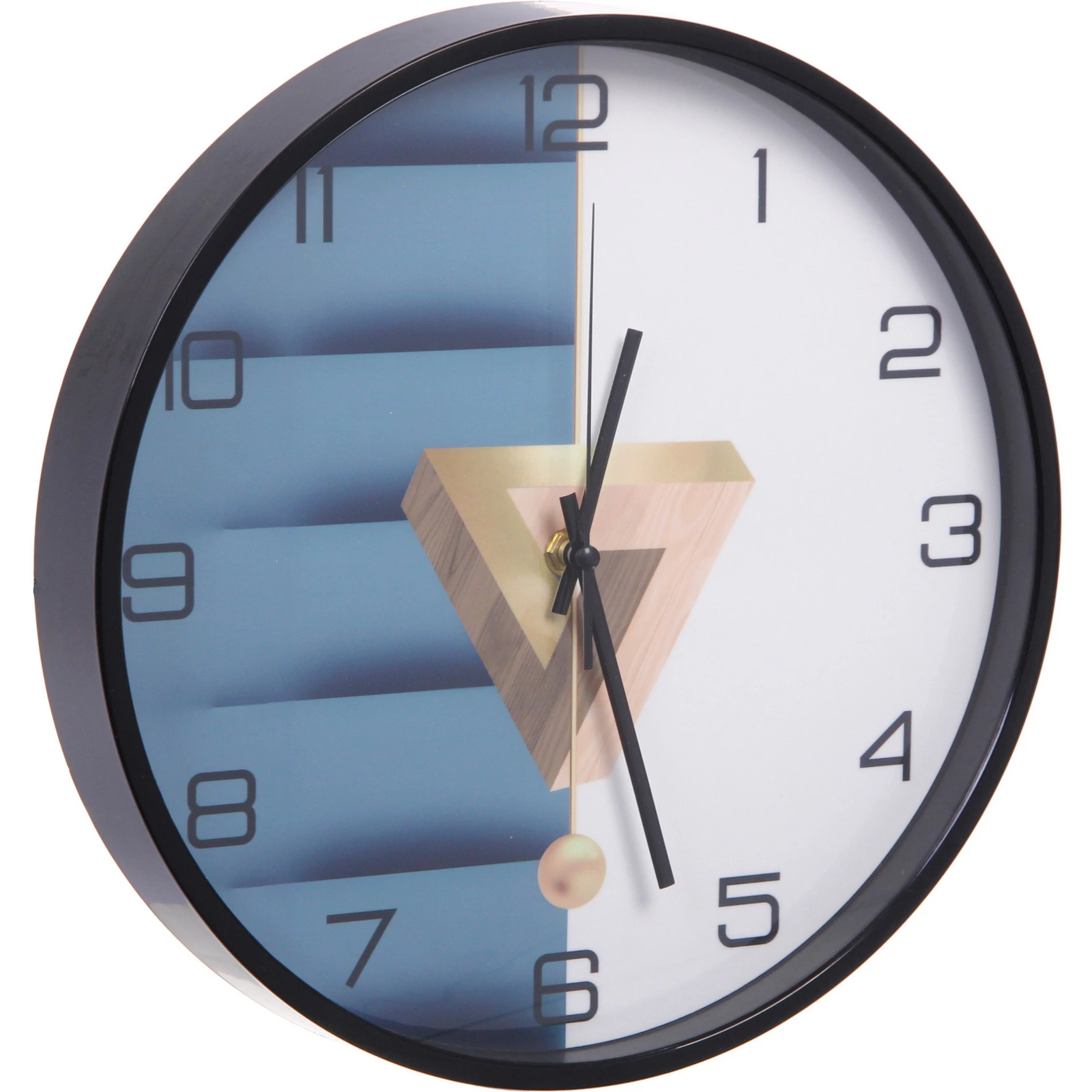 - Настенные часы круглой формы с уникальным двухцветным циферблатом (синий и белый) и абстрактным центральным элементом в виде золотистой треугольной фигуры.