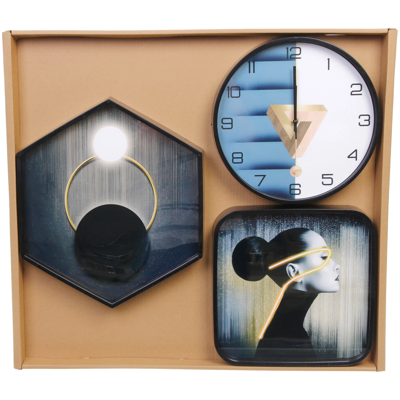 Корпуса всех трех предметов выполнены в черном цвете, что делает набор лаконичным и легко вписывающимся в любую цветовую палитру комнаты. Абстрактные и графические изображения на панно нанесены на качественную основу под защитным слоем. Часы работают от стандартной батарейки типа АА (в комплект не входит).