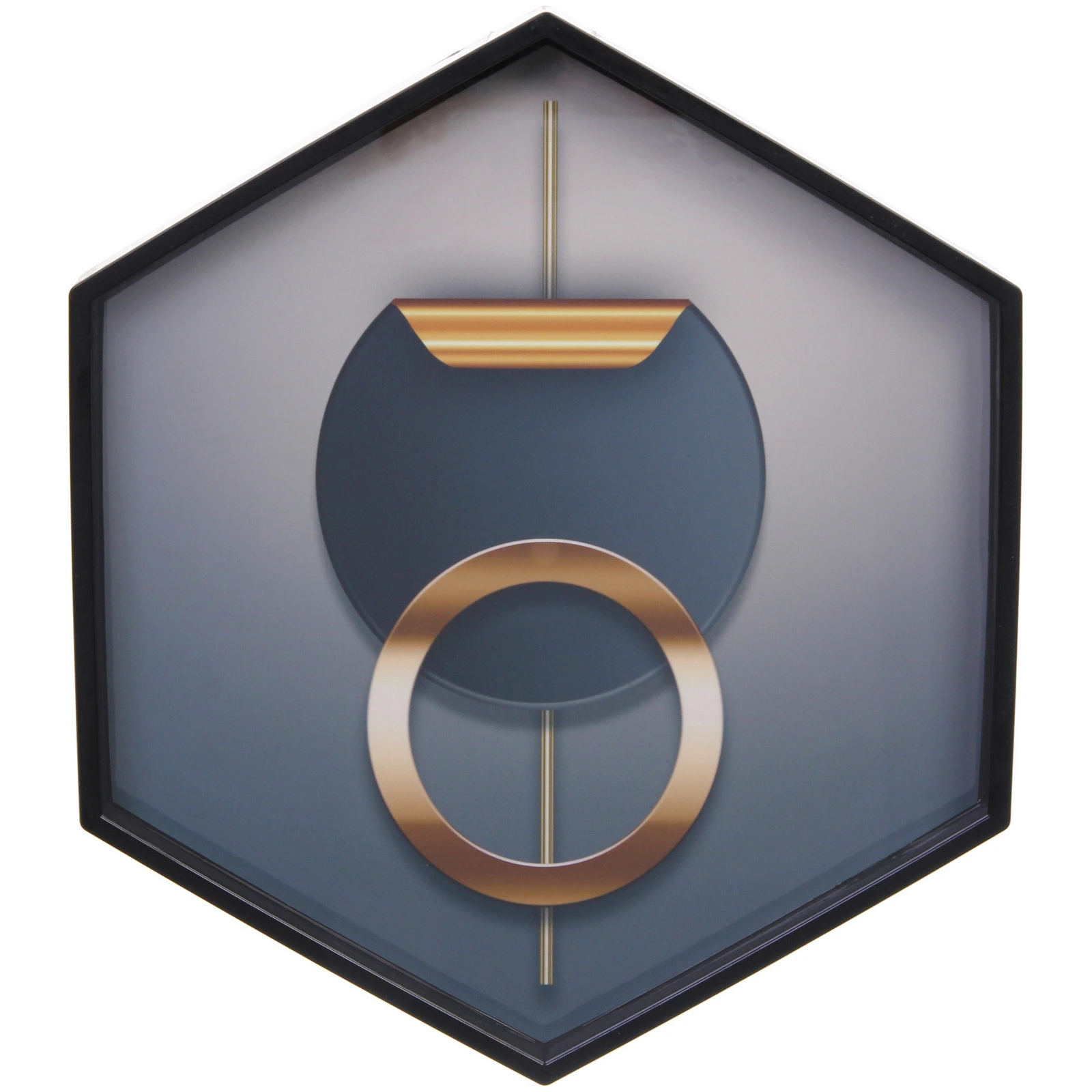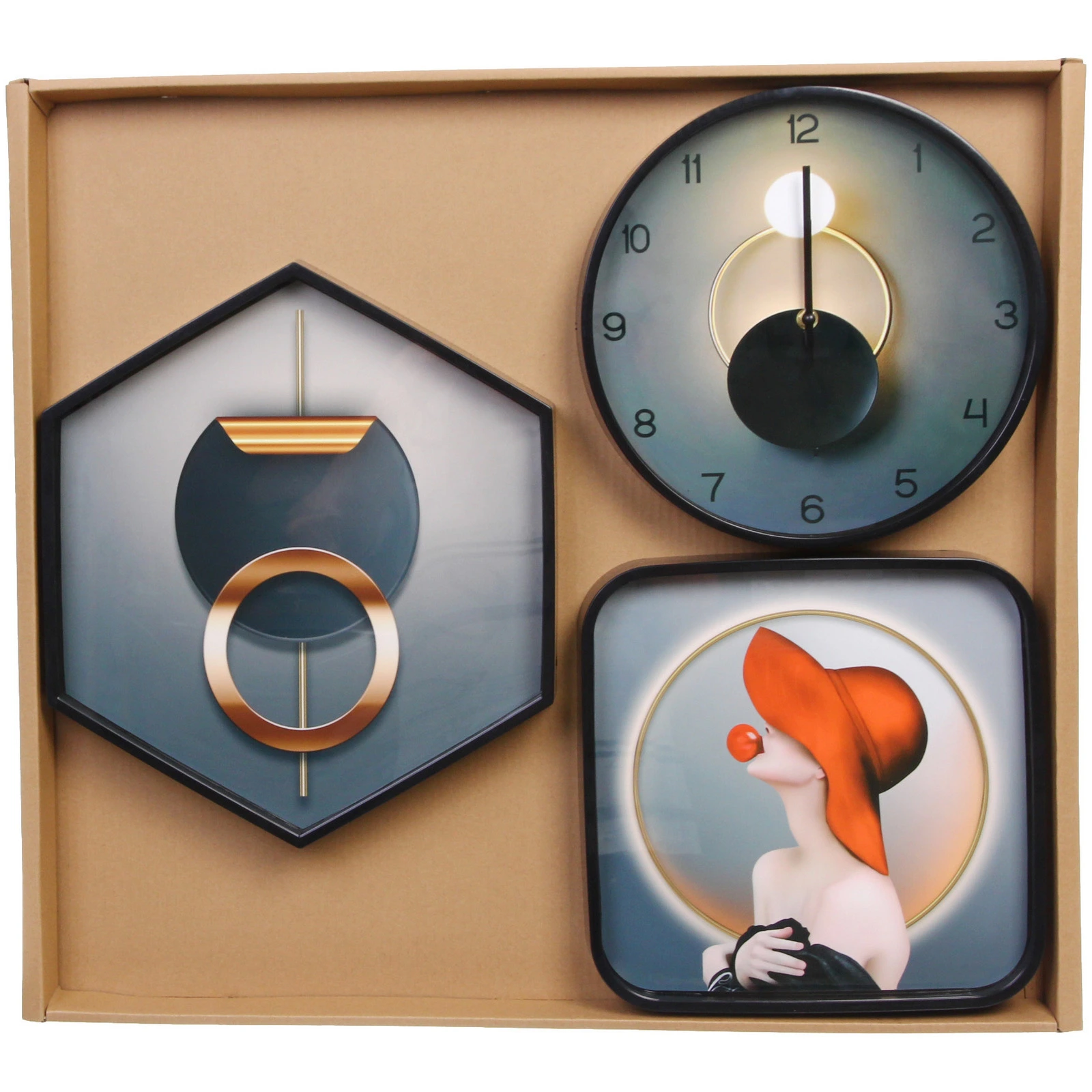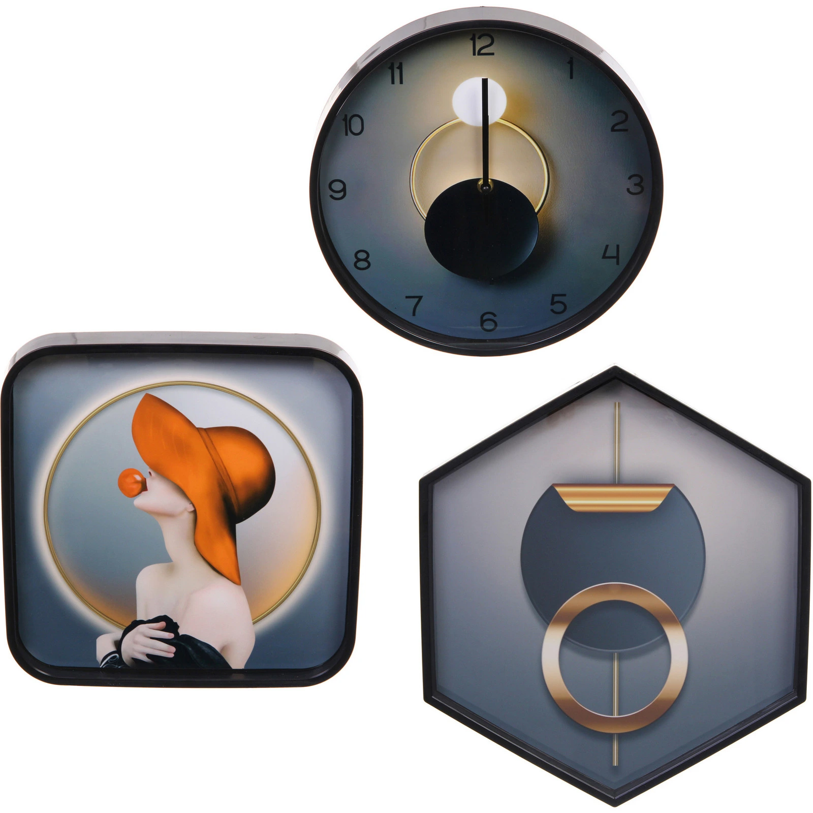 Все три предмета выполнены в единой палитре, где сочетаются глубокие серо-синие градиенты, черные рамки и теплые золотистые акценты. Квадратное панно с фигурой человека в шляпе добавляет художественности, а пятиугольное — геометрическую строгость. Часы с крупными цифрами остаются легко читаемыми даже на расстоянии.