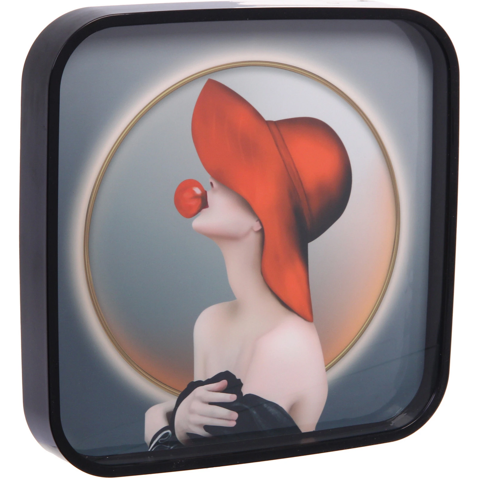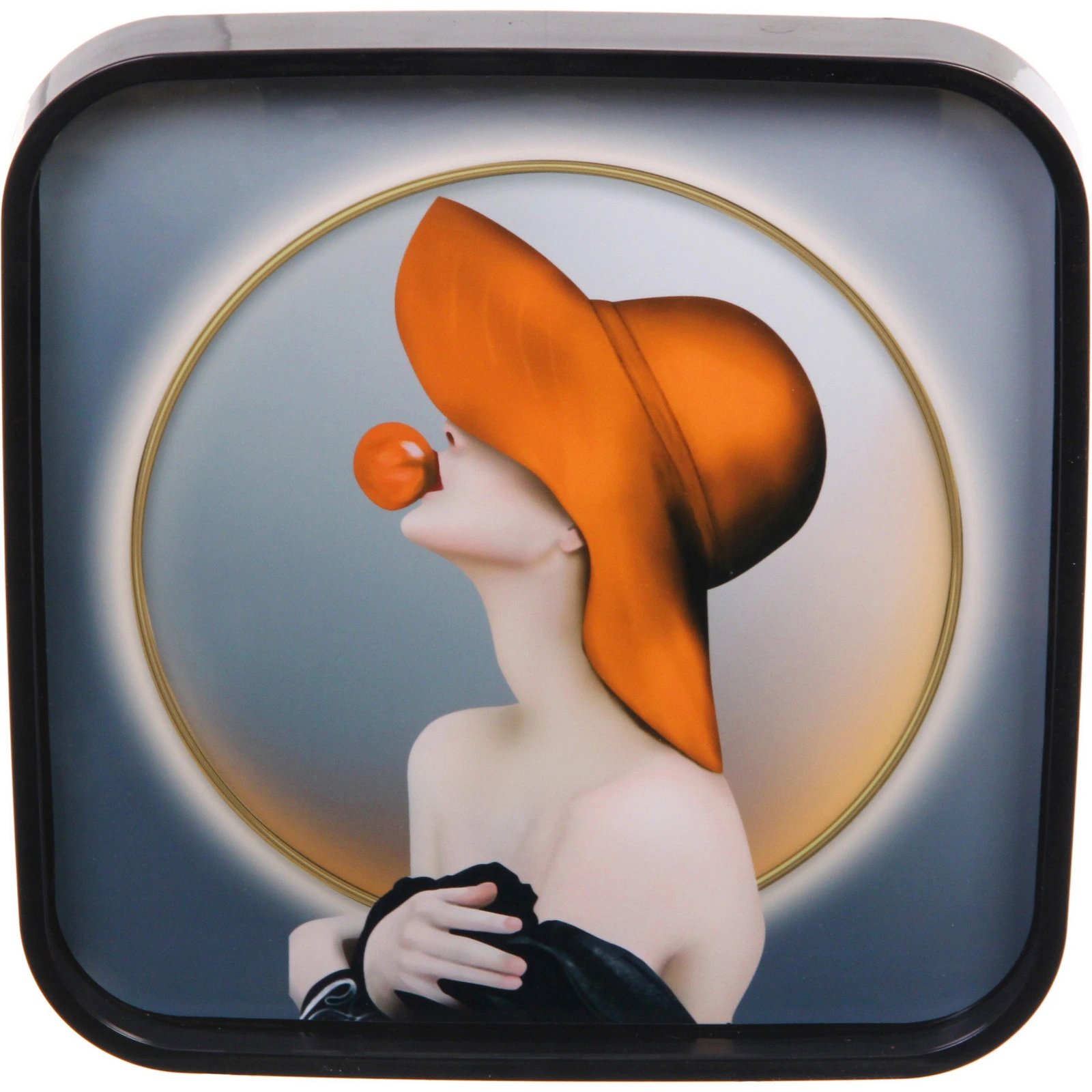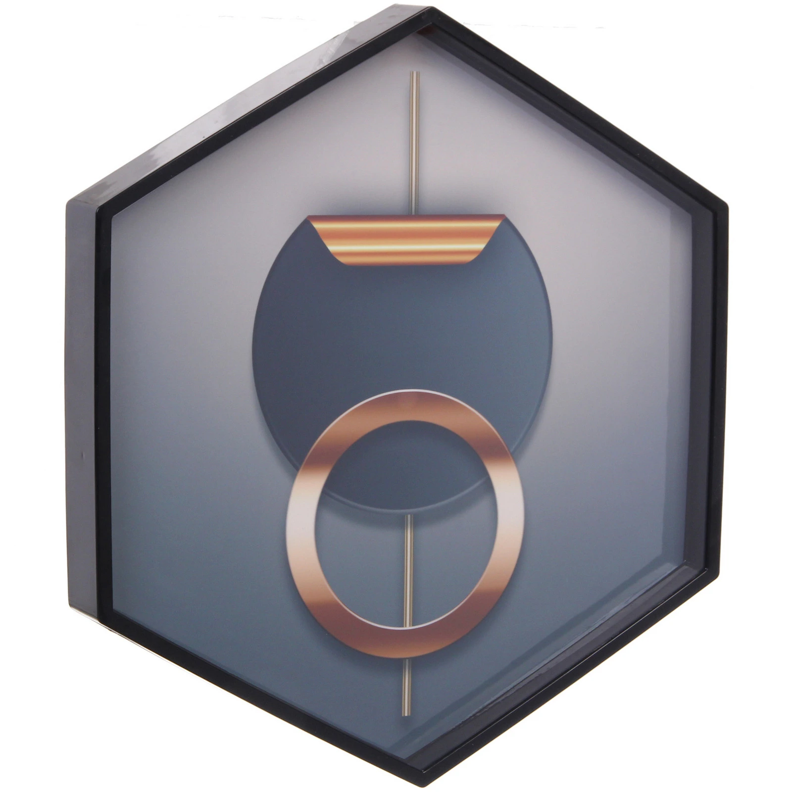 Все три предмета выполнены в единой палитре, где сочетаются глубокие серо-синие градиенты, черные рамки и теплые золотистые акценты. Квадратное панно с фигурой человека в шляпе добавляет художественности, а пятиугольное — геометрическую строгость. Часы с крупными цифрами остаются легко читаемыми даже на расстоянии.