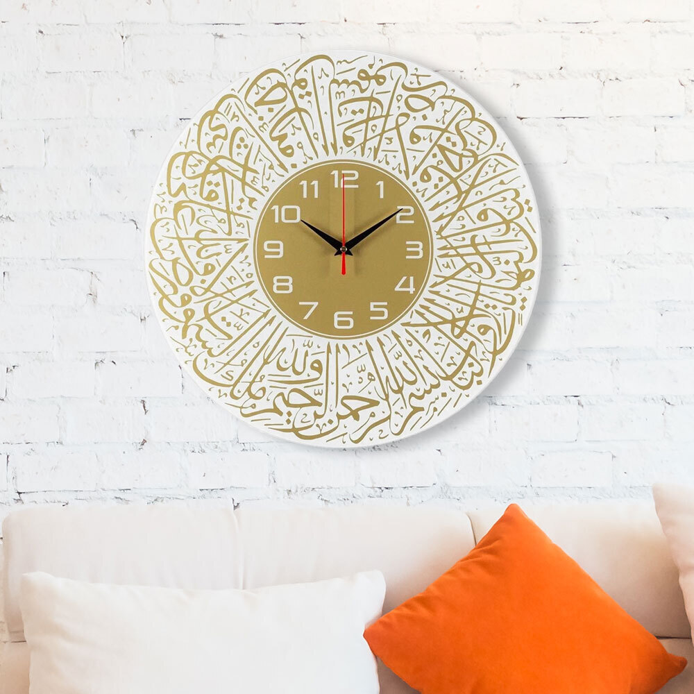 Оцените изысканность настенных стеклянных часов диаметром 39см с золотисто-бежевым циферблатом. Декоративная окантовка с орнаментом и арабской каллиграфией добавляет вашему интерьеру атмосферу уюта и уважения к традициям. Благодаря четким белым арабским цифрам вы всегда увидите точное время, а открытaя стрелка придаёт дизайну завершённость и строгую аккуратность.