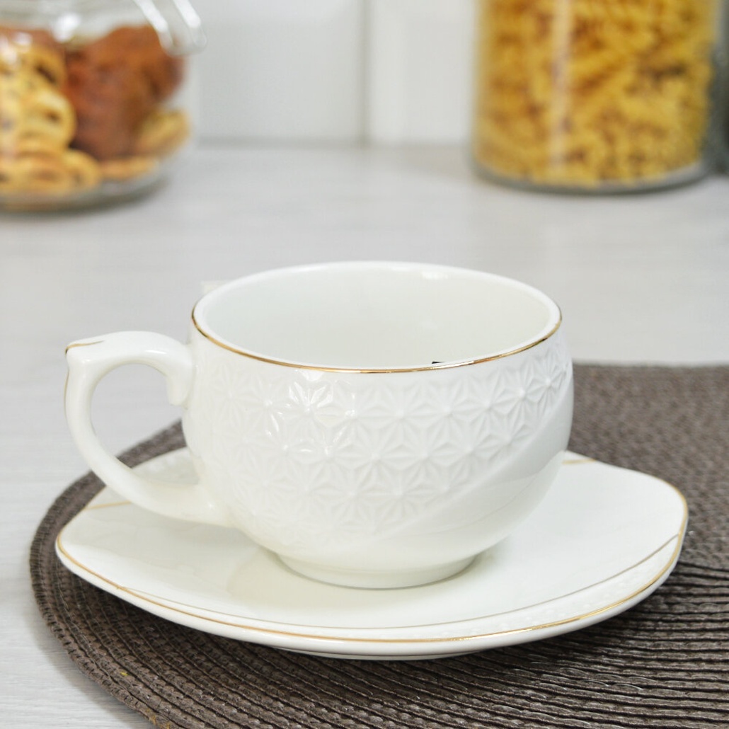 Классический белый цвет с изящным рельефным узором и золотистой окантовкой создает неповторимую атмосферу уюта. Фарфоровая чайная пара станет достойным дополнением вашей коллекции посуды или прекрасным подарком.