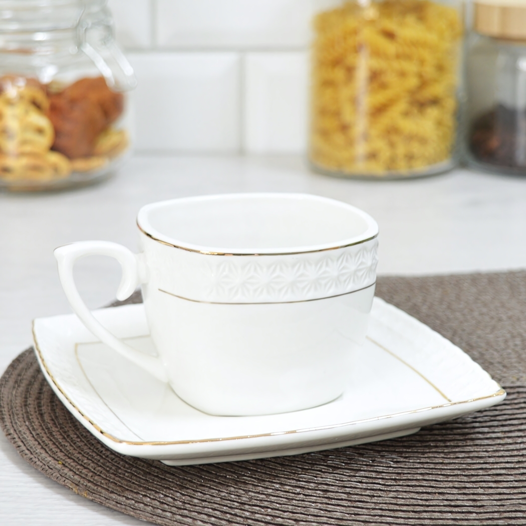 Золотые акценты и рельефные элементы украшают как чашку, так и блюдце. Белоснежный фарфор подчеркивает чистоту и элегантность комплекта. Уникальная форма блюдца и изящная ручка чашки делают сервировку особенно привлекательной.
