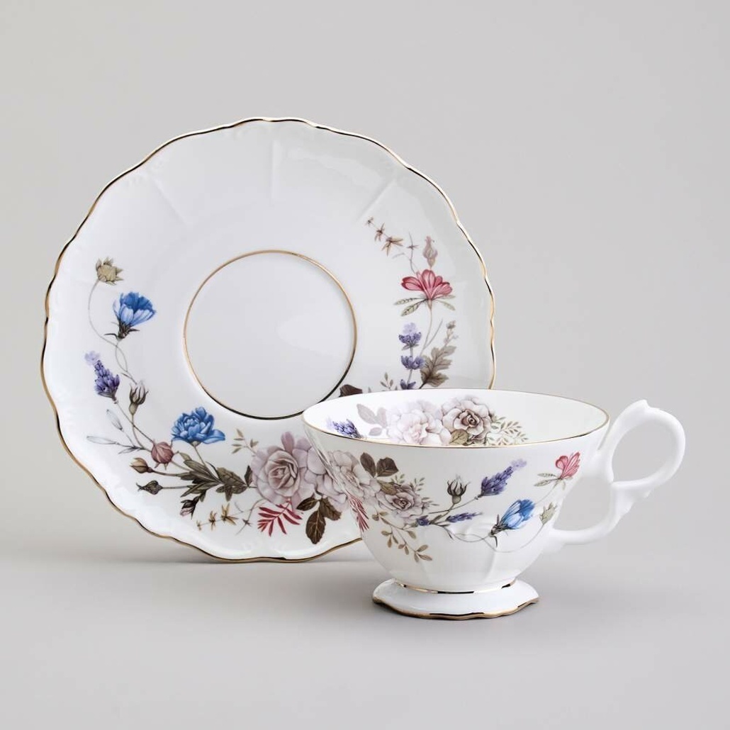 Чайная пара 'Belle' 280мл, фарфор, белая с цветочной росписью и золотистым кантом
