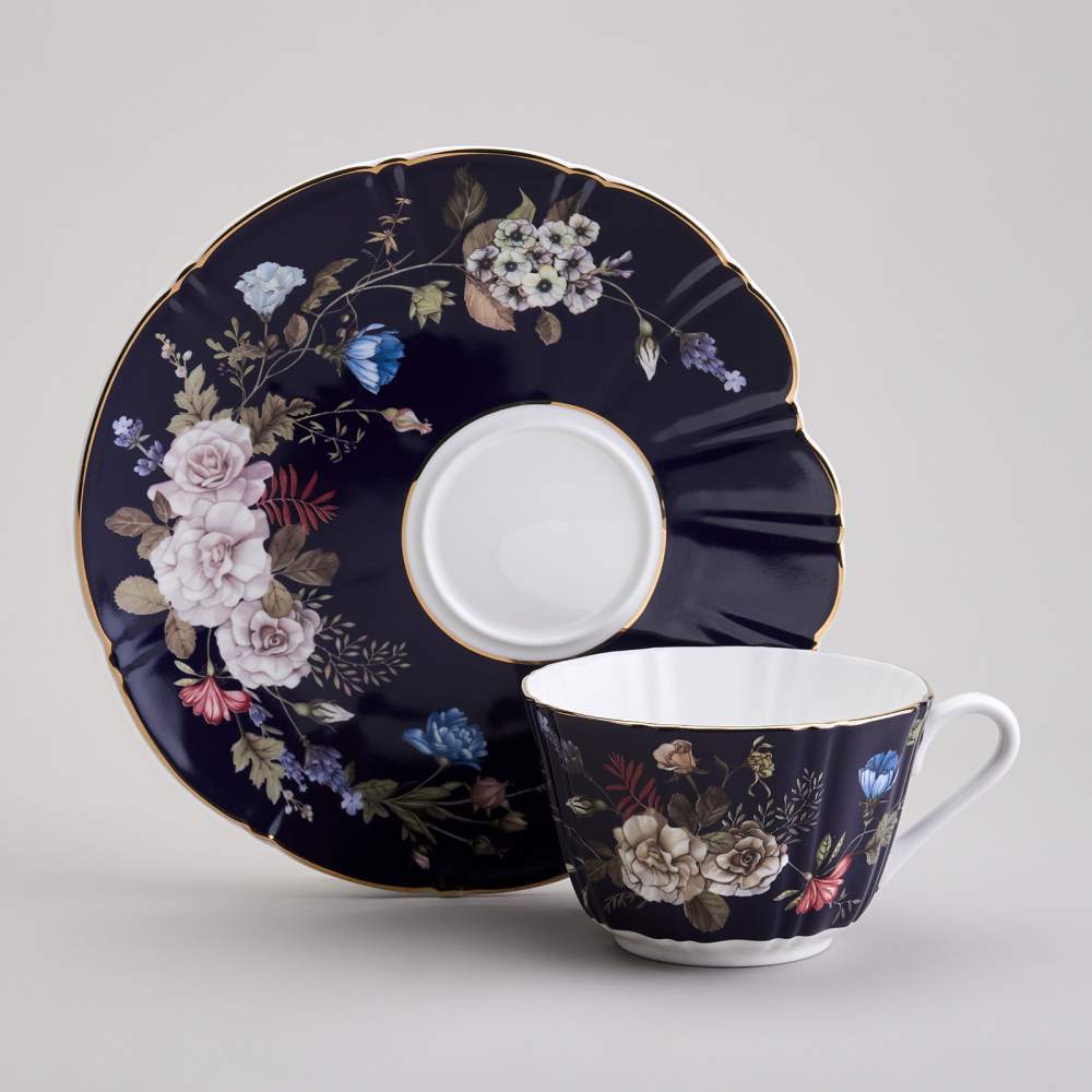 Насладитесь атмосферой роскошного чаепития с изящной чайной парой 'Кобальт'. Её нежный цветочный узор и благородный золотой ободок создают особое настроение за вашим столом.