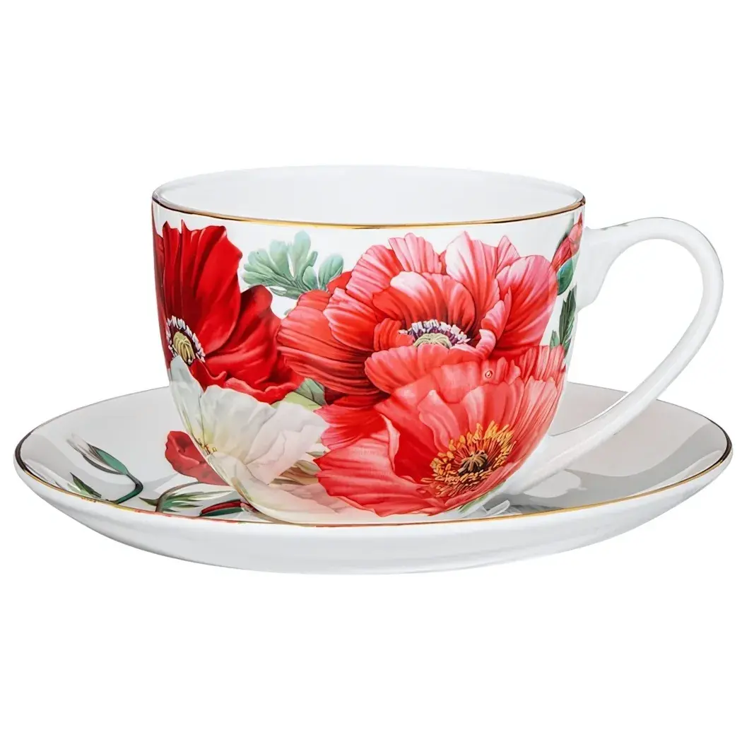 Эта чайная пара объемом 330 мл из коллекции «Маки» станет не только функциональным, но и стильным дополнением вашего сервиза. Яркий цветочный узор, вдохновленный цветущими маками, создаст атмосферу уюта и радости во время чаепития. Изготовленная из тонкостенного костяного фарфора, она сочетает в себе элегантность и практичность, что делает её отличным выбором для повседневного использования и особых случаев.
